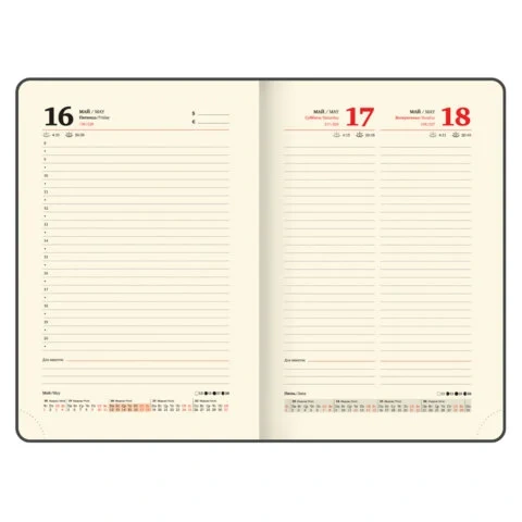 Внутренний блок включает 168 листов тонированной бумаги плотностью 70 г/м2. Каждая страничка имеет перфорированный угол. Благодаря стандартному формату А5 (138х213 мм) ежедневник удобно использовать как в офисе, так и на выездных деловых встречах.