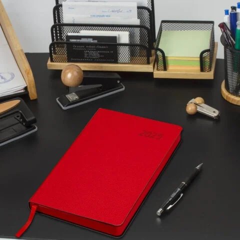 Мягкая (интегральная) обложка стилизована под фактурную кожу насыщенного красного цвета. Подходит для горячего тиснения. Дополнением является закладка-ляссе, с помощью которой при необходимости можно быстро открыть ежедневник на нужной странице. Ежедневник снабжен справочным материалом. В конце имеются 4 страницы для записей и заметок.