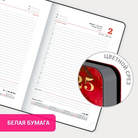 Внутренний блок включает 168 листов белой бумаги плотностью 70 г/м2. Каждая страничка имеет перфорированный угол. Благодаря стандартному формату А5 (138х213 мм) ежедневник удобно использовать как в офисе, так и на выездных деловых встречах.