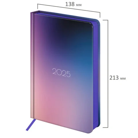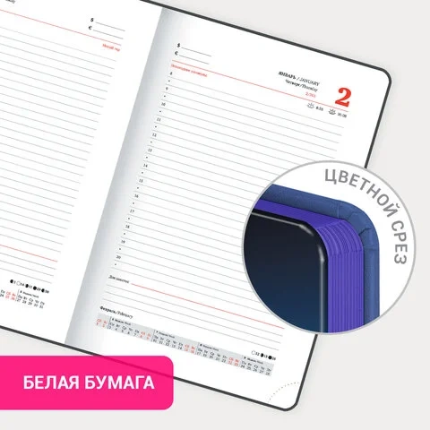 Внутренний блок включает 168 листов белой бумаги плотностью 70 г/м2. Каждая страничка имеет перфорированный угол. Благодаря стандартному формату А5 (138х213 мм) ежедневник удобно использовать как в офисе, так и на выездных деловых встречах.