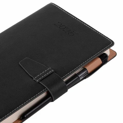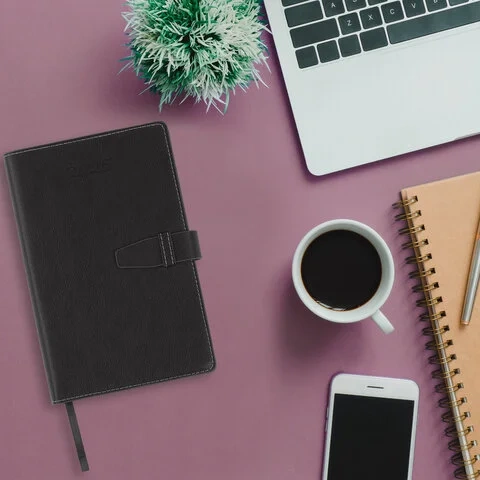 Гибкая обложка стилизована под гладкую кожу. Материал обложки подходит для горячего тиснения. Ежедневник фиксируется застежкой-ремешком, поэтому ежедневник не откроется в сумке или портфеле и страницы не помнутся.