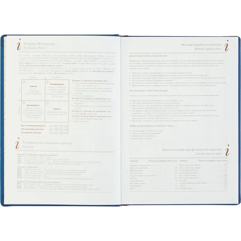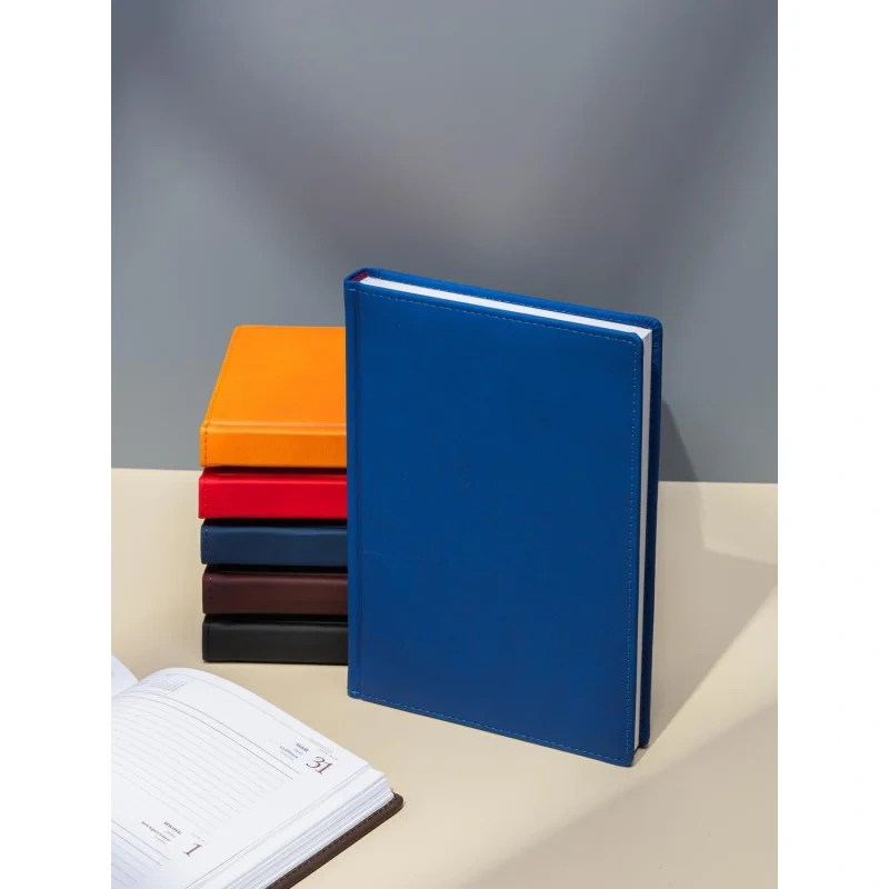 Ежедневник датированный 2025 год Attache Velvet искусственная кожа Soft Touch А5 168 листов синий. Это практичное решение для планирования рабочего времени. Он подходит для офисных работников и студентов, ценящих функциональность и удобство. Твердая обложка выполнена из искусственной кожи Soft Touch. Классический синий цвет и скругленные углы придают изделию строгий и лаконичный вид. Внутренний блок состоит из 168 листов, сделанных из белой офсетной бумаги плотностью 60 г/кв.м. Он включает раздел для планирования, страницу для персональных данных и 16 страниц справочной информации. В справочной информации содержатся полезные таблицы и данные, такие как матрица Эйзенхауэра, термины международной торговли и рекомендации по борьбе со стрессом. Тип линовки - линейка. Печать блока в 2 краски. Тип крепления - сшивка. Размер: 14.6х20.6 см. Ежедневник имеет формат А5. Данный ежедневник - идеальный помощник для структурирования повседневных задач и хранения важной информации. Он будет полезен в любом рабочем пространстве.