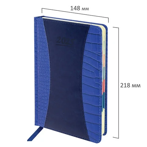 Внутренний блок включает 168 листов тонированной бумаги плотностью 70 г/м2. Каждая страничка имеет перфорированный угол. Благодаря стандартному формату А5 (148х218 мм) ежедневник удобно использовать как в офисе, так и на выездных деловых встречах. Твердая обложка состоит из двух материалов и стилизована под кожу крокодила с вставкой из материала под гладкую кожу. Материал обложки подходит для горячего тиснения.