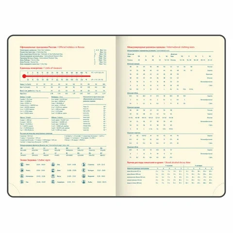Дополнением является закладка-ляссе, с помощью которой при необходимости можно быстро открыть ежедневник на нужной странице, а также вырубка по месяцам. Помимо прочего, ежедневник снабжен обширным справочным материалом. В конце ежедневника есть 6 страниц для записей и заметок. Выполнен в благородном темно-синем цвете.