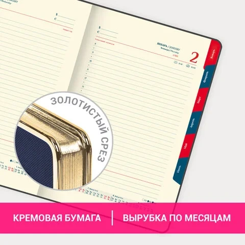 Дополнением является закладка-ляссе, с помощью которой при необходимости можно быстро открыть ежедневник на нужной странице, а также вырубка по месяцам. Помимо прочего, ежедневник снабжен обширным справочным материалом. Выполнен в темно-синем цвете.