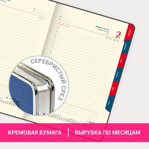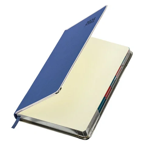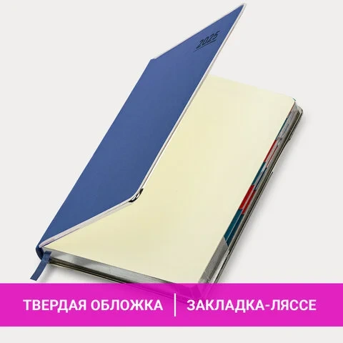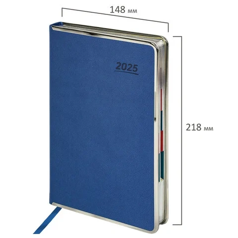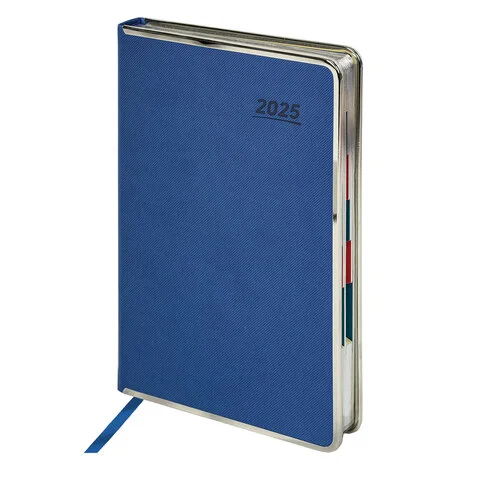 Дополнением является закладка-ляссе, с помощью которой при необходимости можно быстро открыть ежедневник на нужной странице, а также вырубка по месяцам. Помимо прочего, ежедневник снабжен обширным справочным материалом. В конце ежедневника есть 6 страниц для записей и заметок. Выполнен в классическом синем цвете.