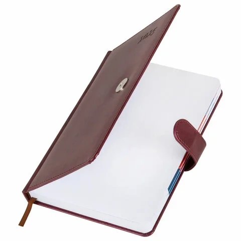 Внутренний блок включает 168 листов белой бумаги плотностью 70 г/м2. Каждая страничка имеет перфорированный угол. Благодаря стандартному формату А5 (148х218 мм) ежедневник удобно использовать как в офисе, так и на выездных деловых встречах. Твердая обложка, прошитая по периметру, стилизованная под гладкую кожу, фиксируется магнитной застежкой, поэтому ежедневник не откроется в сумке или портфеле и страницы не помнутся. Материал обложки подходит для горячего тиснения.