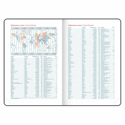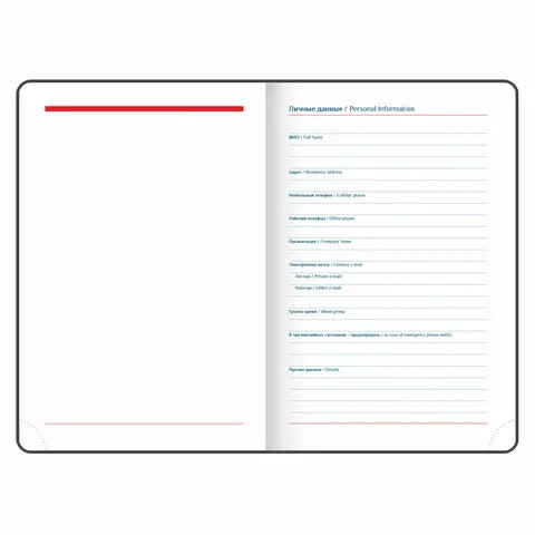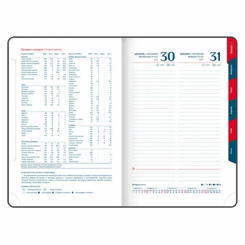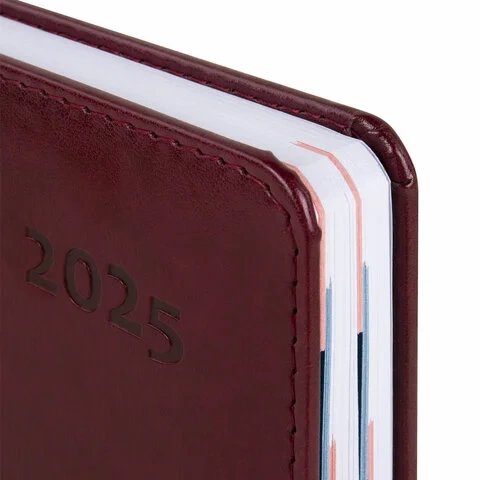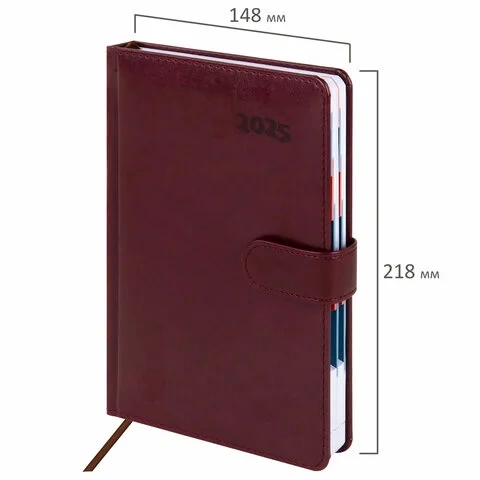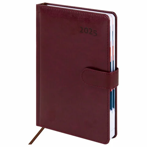 Дополнением является закладка-ляссе, с помощью которой при необходимости можно быстро открыть ежедневник на нужной странице, а также вырубка по месяцам. Помимо прочего, ежедневник снабжен обширным справочным материалом. В конце ежедневника есть 6 страниц для записей и заметок. Выполнен в классическом бордовом цвете.
