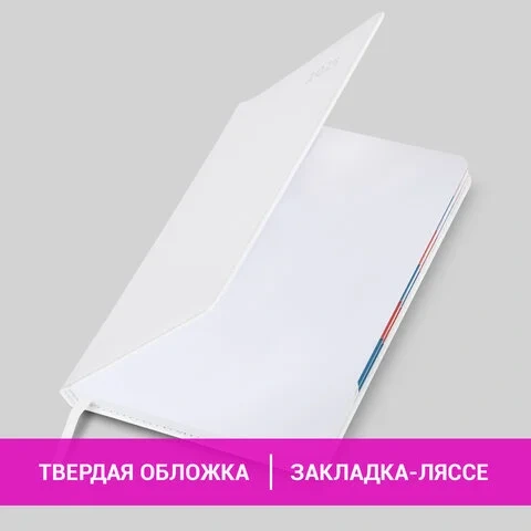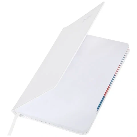 Внутренний блок включает 168 листов белой бумаги плотностью 70 г/м2. Каждая страничка имеет перфорированный угол. Благодаря стандартному формату А5 (148х218 мм) ежедневник удобно использовать как в офисе, так и на выездных деловых встречах. Твердая обложка, прошитая по периметру, стилизованная под гладкую кожу классического белого цвета. Материал обложки подходит для горячего тиснения.