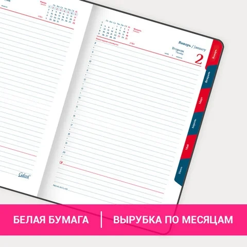 Дополнением является закладка-ляссе, с помощью которой при необходимости можно быстро открыть ежедневник на нужной странице, а также вырубка по месяцам. Помимо прочего, ежедневник снабжен обширным справочным материалом. В конце ежедневника есть 6 страниц для записей и заметок.