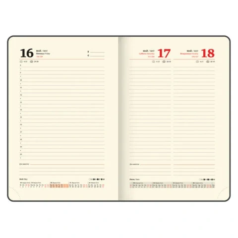 Внутренний блок включает 168 листов кремовой бумаги плотностью 70 г/м2. Каждая страничка имеет перфорированный угол. Благодаря классическому формату А5 (151х213 мм) ежедневник удобно использовать как в офисе, так и на выездных деловых встречах.