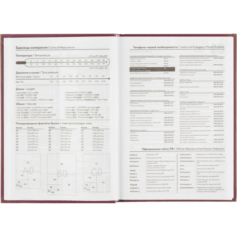 Ежедневник датированный 2025 год Выбор есть бумвинил А5 160 листов бордовый. Предназначен для удобного планирования и организации рабочего времени. Он идеально подходит для использования в офисе и повседневной жизни. Данный ежедневник имеет размер А5. Материал обложки - бумвинил бордового цвета. Ее дизайн -универсальный. Обложка твердая. Ежедневник содержит 160 листов, сделанных из белой офсетной бумаги плотностью 55 г/кв.м. Листы имеют белый цвет обреза. На один будний день предусмотрена отдельная страница с временным интервалом с 8:00 до 20:00 и свободными строками для заметок. Тип крепления - сшивка. Печать блока в 1 краску. Вид линовки - линейка. Размер: 14x20 см. Внутренний блок включает информационно-справочный раздел с личными данными, календарями на 2025 и 2026 годы, а также разделы для планирования на год, дней рождений и праздников России. Дополнительно содержится информация о единицах измерения, питании и расходе калорий, товарных штрих-кодах производителей, а также телефонах первой необходимости и официальных сайтах РФ. Ежедневник не имеет застежки и петли для ручки. Прошитый тип крепления надежно удерживает блок, что делает его долговечным и практичным для ведения записей, использования во время встреч и переговоров.