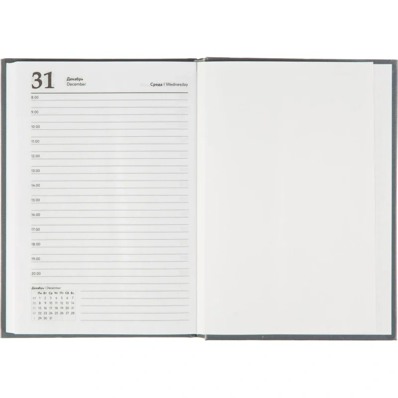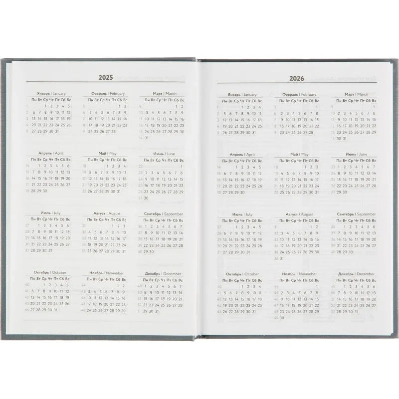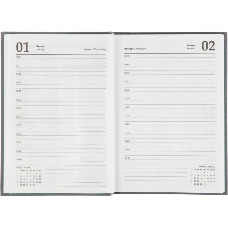 Ежедневник датированный 'Выбор есть' на 2025 год. Размер блока: 140x200 мм, размер изделия: 147x206 мм. Обложка из твердого картона и бумвинила серого цвета. Стиль обложки универсальный, офисный. Прошитый тип крепления надежно держит блок. Блок: датированный на 2025 год, 160 листов (320 страниц), бумага белый офсет, плотностью 55 г/кв.м, печать в блоке в 1 краску. Цвет обреза белый. Содержит информационно-справочный блок - личные данные, календарь на 2025 и 2026 год, раздел 'планирование на год', раздел 'дни рождения', информацию о праздниках России, единицах измерения, раздел 'питание и расход калорий', раздел 'товарный штрих-код производителя', информацию о телефонах первой необходимости и официальных сайтах РФ. На один будний день приходится одна страница, временной интервал - 1 час с 8:00 до 20:00 свободные строки. Нет петли для ручки. Удобен для записи переговоров, встреч.