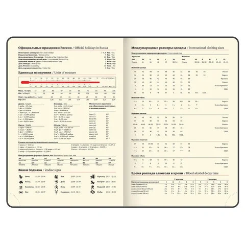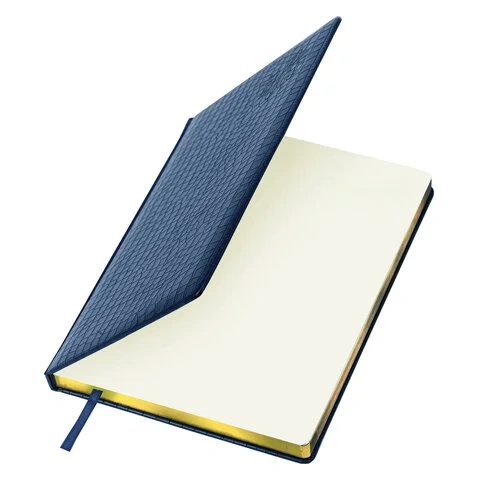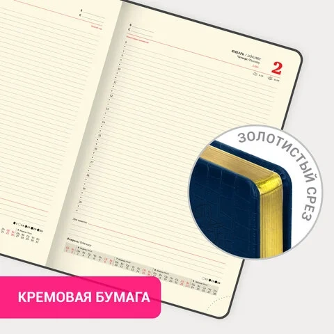 Внутренний блок включает 168 листов тонированной бумаги плотностью 70 г/м2. Каждая страничка имеет перфорированный угол. Благодаря большому формату А4 (210x297 мм) ежедневник удобно использовать как в офисе, так и на выездных деловых встречах. Твердая обложка стилизована под кожу крокодила классического синего цвета. Материал обложки подходит для горячего тиснения. Срез ежедневника фольгирован золотой фольгой, что придает ему особый шарм. Дополнением является закладка-ляссе, с помощью которой при необходимости можно быстро открыть ежедневник на нужной странице. Ежедневник снабжен обширным справочным материалом.