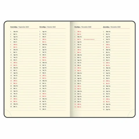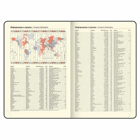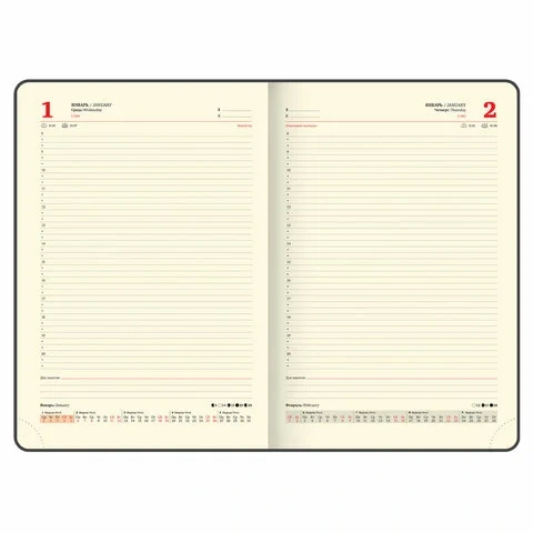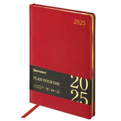 Внутренний блок включает 168 листов тонированной бумаги плотностью 70 г/м2. Каждая страничка имеет перфорированный угол. Благодаря большому формату А4 (210х297 мм) ежедневник удобно использовать как в офисе, так и на выездных деловых встречах. Твердая обложка красного цвета стилизована под кожу рептилии. Подходит для горячего тиснения. Срез ежедневника фольгирован золотой фольгой, что придает ему особый шарм. Дополнением является закладка-ляссе, с помощью которой при необходимости можно быстро открыть ежедневник на нужной странице. Ежедневник снабжен обширным справочным материалом.