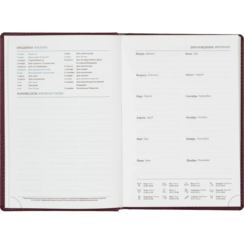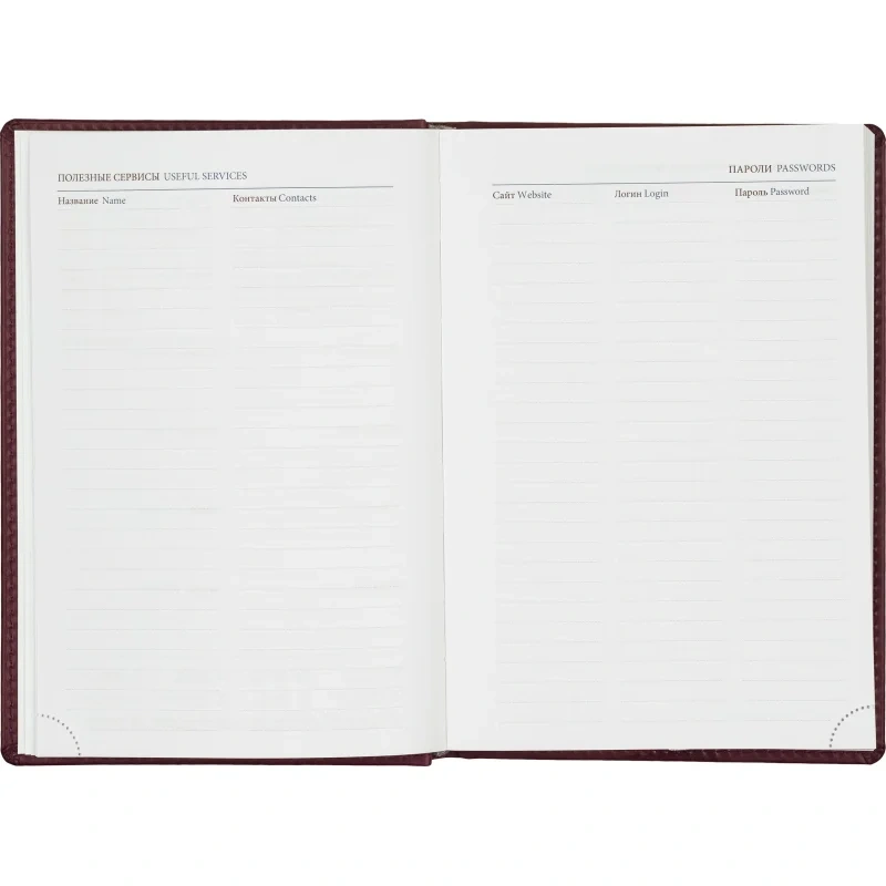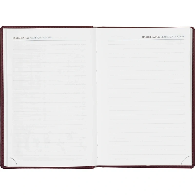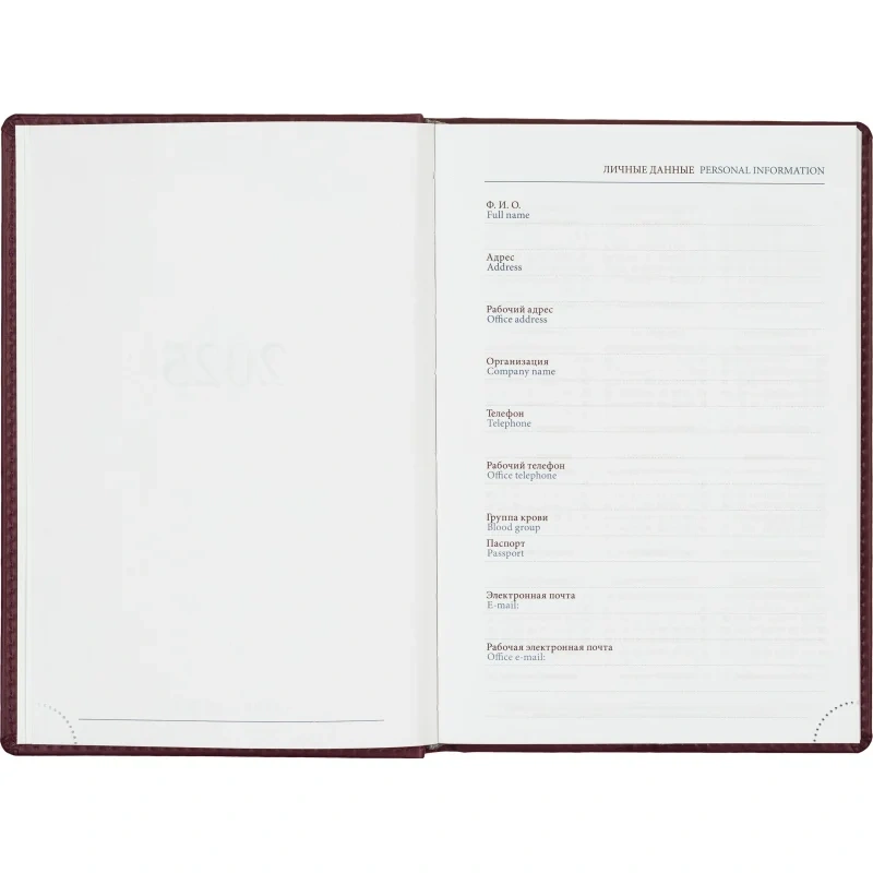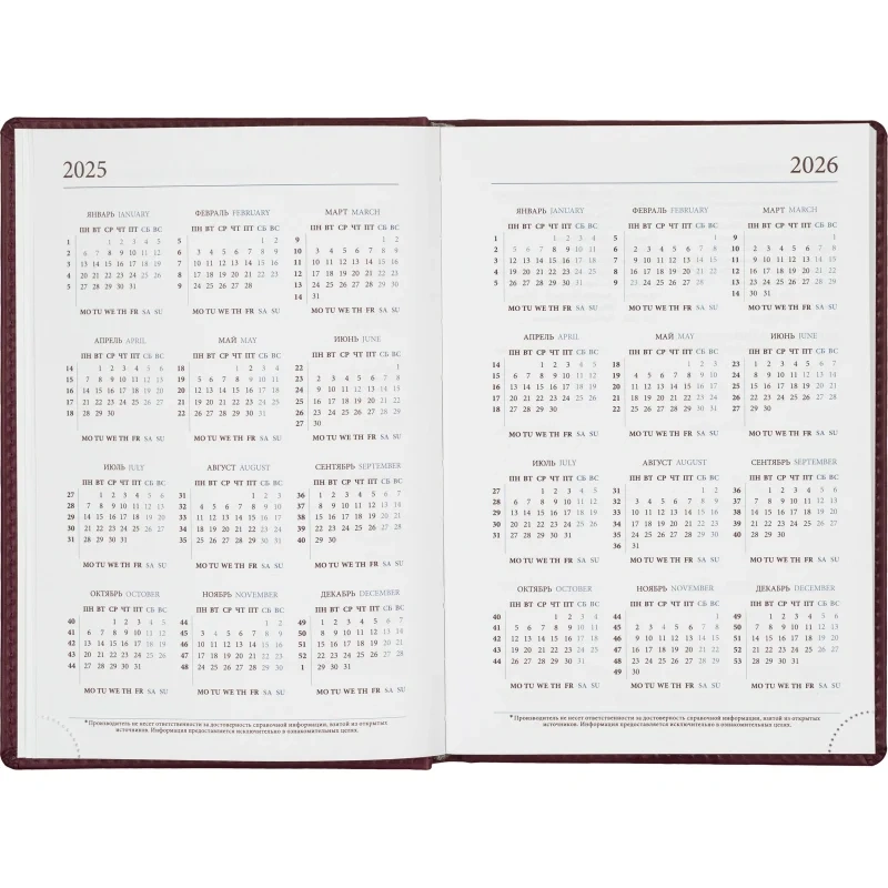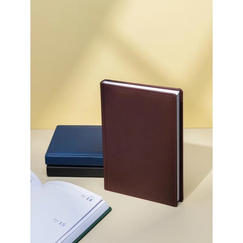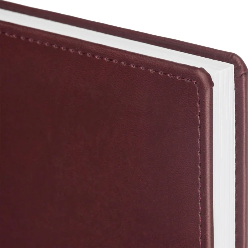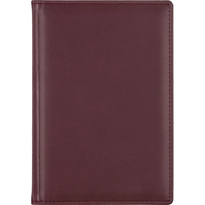 Ежедневник датированный 2025 год Attache Вива искусственная кожа А5 176 листов бордовый. Предназначен для планирования и организации вашего времени. Он удобно вписывается в рабочую среду, подходит как для офиса, так и для личного использования. Данный ежедневник имеет формат А5. Твердая обложка выполнена из высококачественной искусственной кожи бордового цвета. Материал обложки обеспечивает долговечность и стильный внешний вид. Дизайн обложки универсален. Каждый ежедневник содержит 176 листов, выполненных из белой офсетной бумаги плотностью 70 г/кв.м. Предусмотрена перфорация уголка для удобства использования. Внутри есть разделы для личных данных, праздников, дней рождения, полезных сервисов и заметок. Дополнительно включен календарь на 2025-2026 гг. Тип крепления - сшивка. Печать блока в 2 краски. Вид линовки - линейка. Размер: 14.8х21.8 см. Ежедневник не оснащен застежкой, что обеспечивает легкость в использовании. На обложку можно нанести логотип любым методом тиснения. Ляссе серебристого цвета добавляет стильный акцент, а разнообразные информационно-справочные блоки делают его практичным инструментом для организации повседневной жизни.