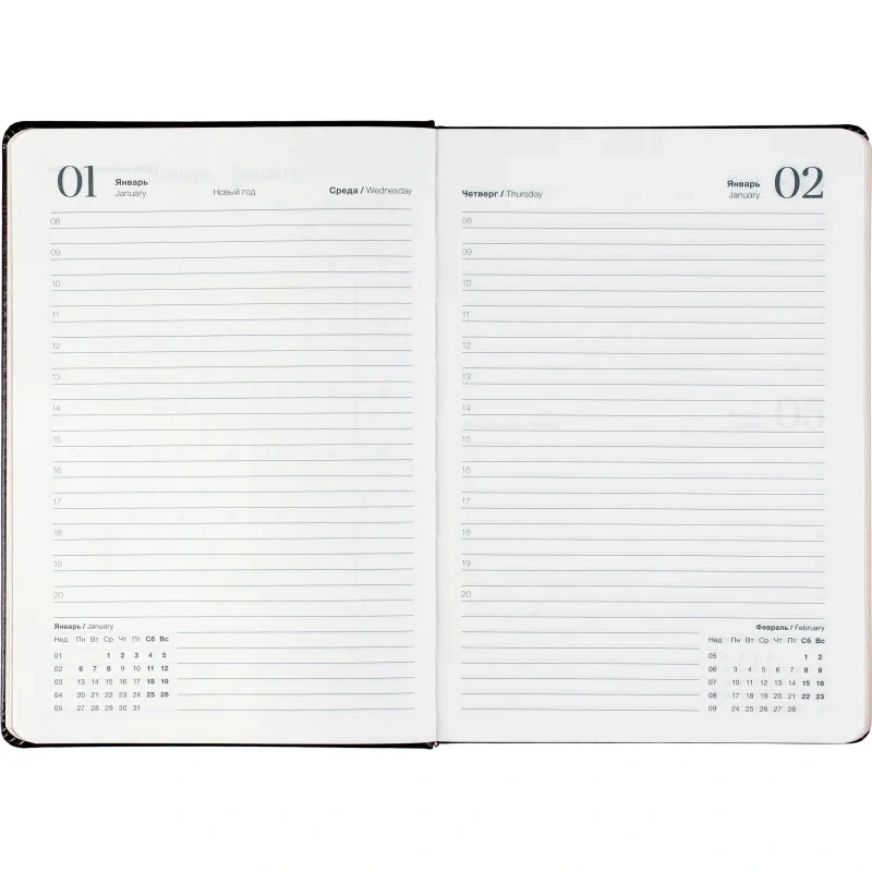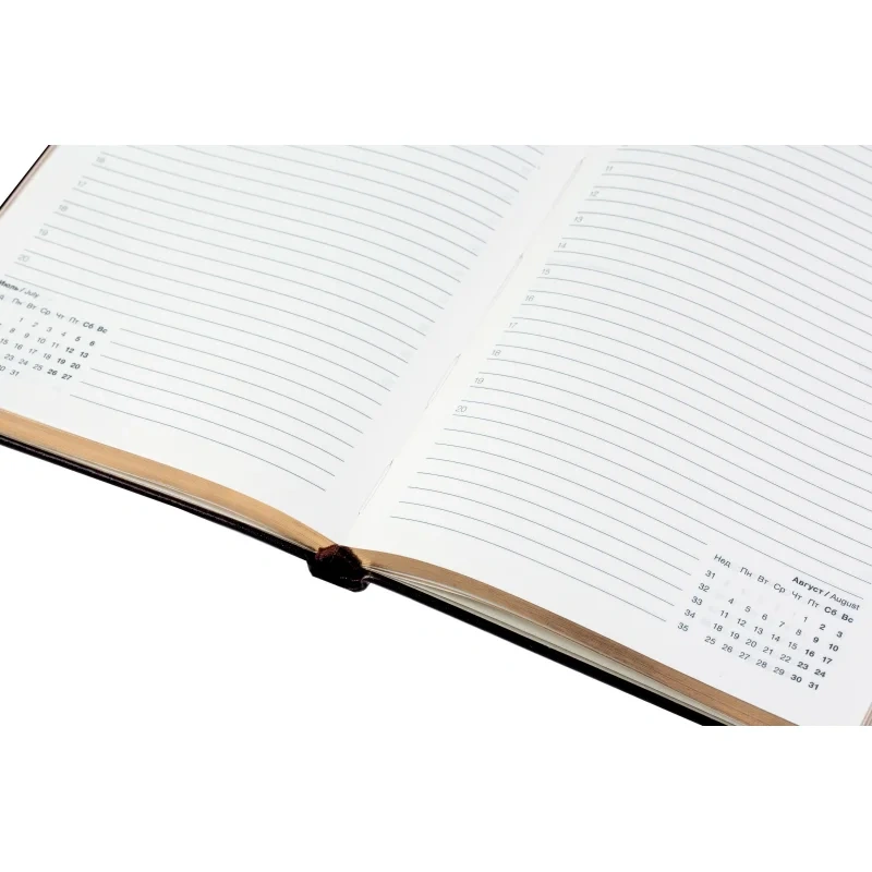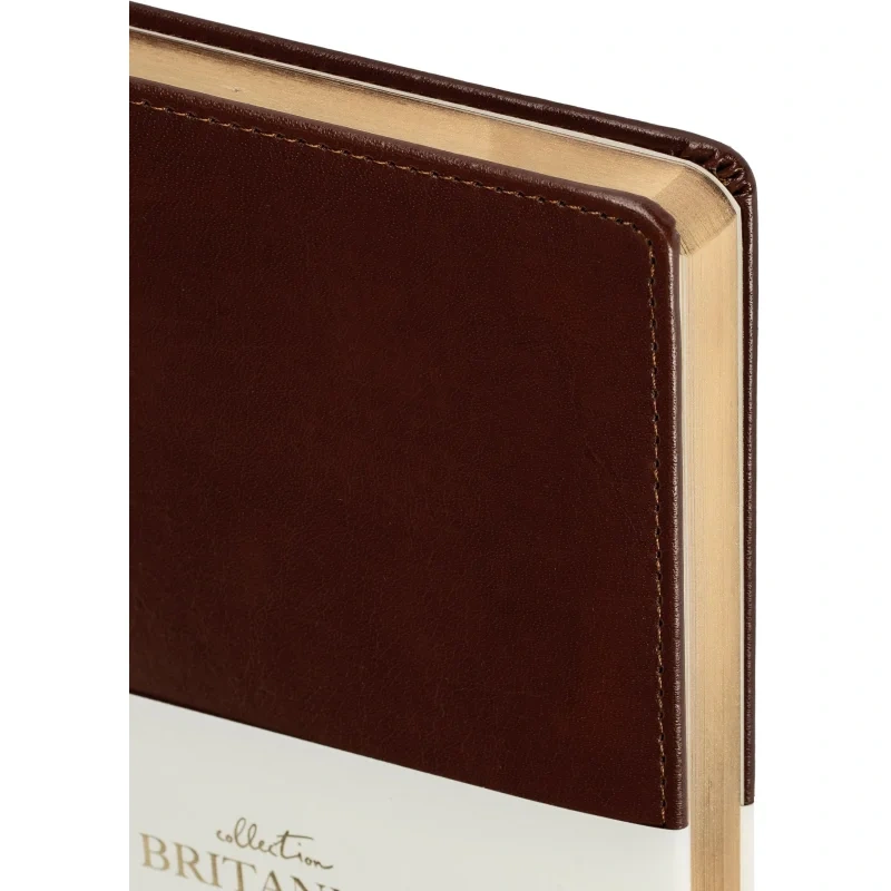 Britannia' от Infolio - это настоящая премиальная классика во всехее проявлениях. Шикарный цвет кожи, золоченый обрез и блок цвета слоновой кости - вот, что создает аксессуар, который подчеркнет статус и вкус владельца. Идеальный подарок для солидного мужчины!Удобный датированный на 2025 год ежедневник А5 формата (140х200 мм) будет не только незаменимым помощником в ведении дел, но и станет стильным аксессуаром, отражающим индивидуальность владельца. Твердая с поролоном обложка из гладкой натуральной рециклированной кожи с прострочкой по периметру имеет удобный кармашек для мелочей на нахзаце и скругленные уголки, которые не позволят порвать подкладку сумки. Благодаря крепкому ниткошвейному скреплению ежедневник верно прослужит весь год.Датированный внутренний блок в линейку на 176 листов (352 страницы) - из высококачественной бумаги цвета слоновой кости плотностью 70 г/м2 со скругленными уголками и окрашенным в золото обрезом. Информационный блок ежедневника включает в себя: титульный лист, календари на 2025-2026 гг, раздел 'планы на год', развороты для заметок в начале и конце блока, планнер перед каждым месяцем.В ежедневнике также имеются две удобные атласные закладки, которые помогут быстро найти нужные развороты.