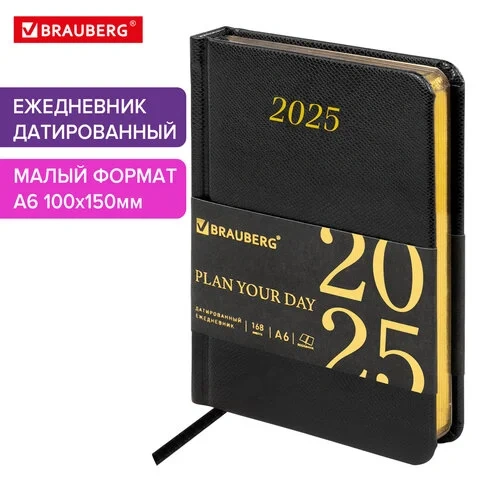 Ежедневник датированный 2025 МАЛЫЙ ФОРМАТ 100х150 мм А6, BRAUBERG 'Iguana', под кожу, черный, 115744