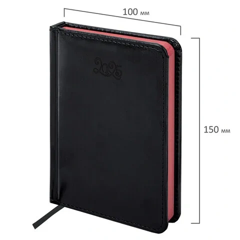 Внутренний блок включает 168 листов белой бумаги плотностью 70 г/м2. Каждая страничка имеет перфорированный угол. Благодаря малому формату А6 (100х150 мм) ежедневник удобно использовать как в офисе, так и на выездных деловых встречах. Твердая обложка черного цвета стилизована под гладкую кожу. Подходит для горячего тиснения. Срез и форзац ежедневника окрашены на контрасте с цветом обложки, что придает ему особый шарм. Дополнением является закладка-ляссе, с помощью которой при необходимости можно быстро открыть ежедневник на нужной странице. Помимо прочего, ежедневник снабжен обширным справочным материалом.