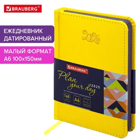 Ежедневник датированный 2025 МАЛЫЙ ФОРМАТ 100х150 мм А6, BRAUBERG 'Rainbow', под кожу, желтый, 11575