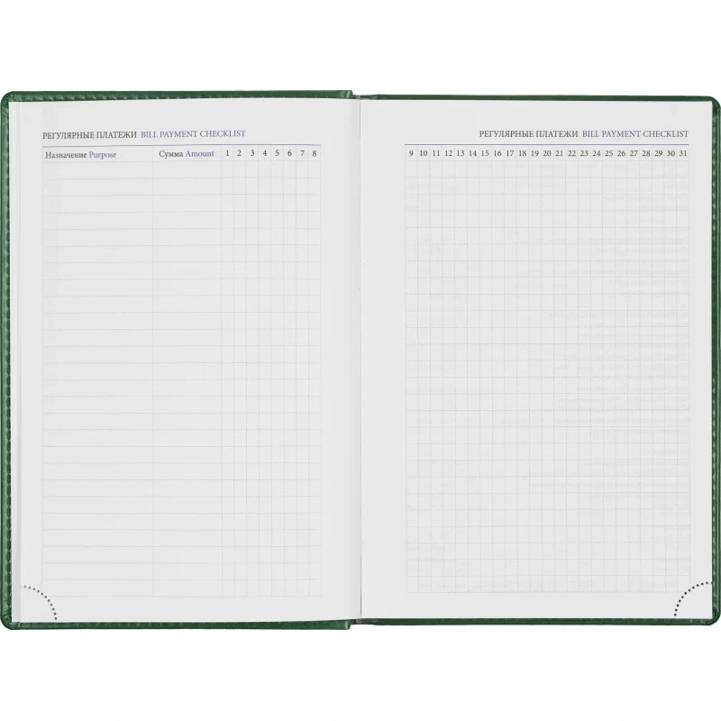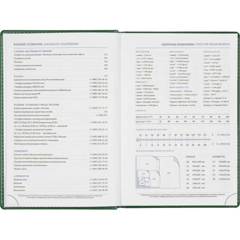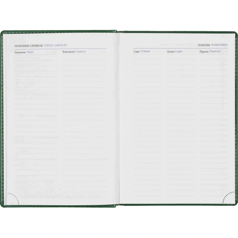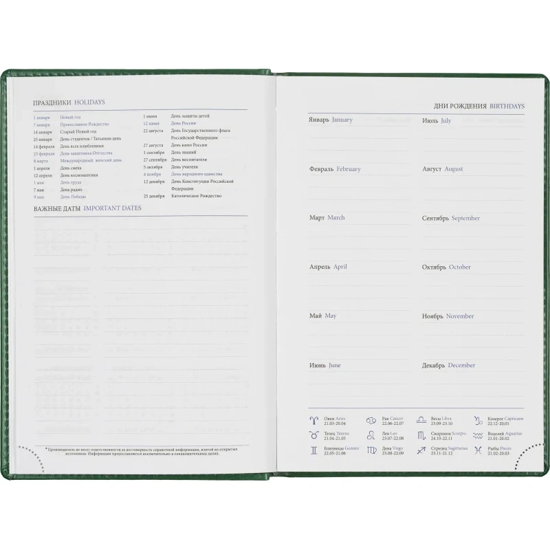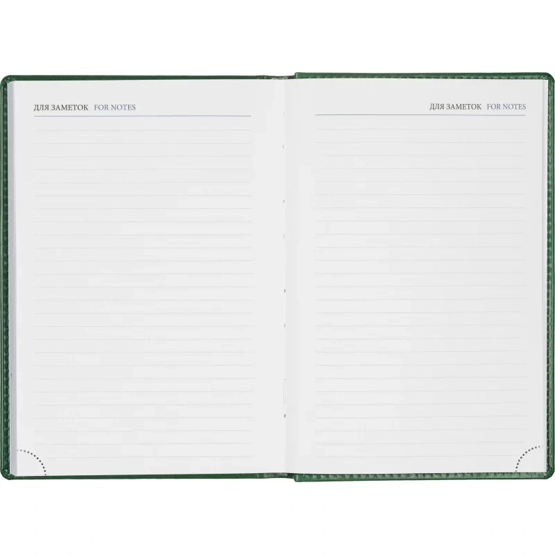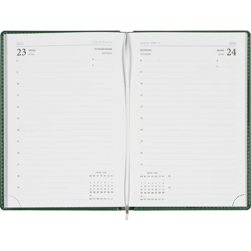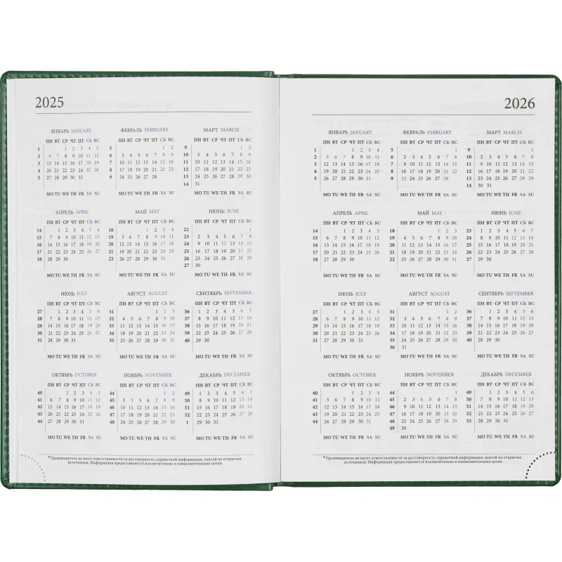 Ежедневник формата А5 датированный на 2025 год, цвет зеленый 148х218 мм, ляссе серебристого цвета, 352 страницы, блок в 2 краски, календарь на 2025-2026 гг. Обложка из высококачественного переплетного материала зеленого цвета, имитирующего натуральную кожу, с поролоном. Возможно нанесение логотипа на обложку любым способом тиснения. Блок: офсет 70 г/кв.м (линейка), перфорация уголка. Содержит информационно-справочный блок - личные данные, праздники, дни рождения, полезные сервисы, пароли, регулярные платежи, важные телефоны, единицы измерения, форматы бумаги, товарный штих-код, размеры одежды, символы по уходу за одеждой, планы на год, блок для заметок.