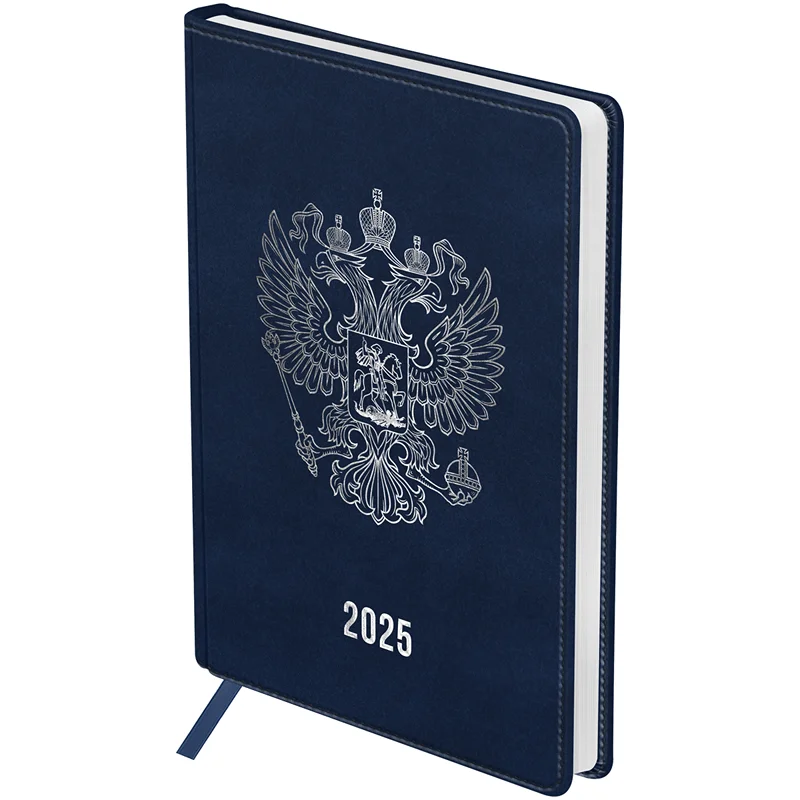 Датированный ежедневник на 2025 год BG серии «Орёл» подходит для деловых людей, которые ценят организованность и эффективность. Изделие формата А4 (205*290 мм) состоит из 176 листов тонированной бумаги плотностью 70 г/м2, которая подходит для любых типов ручек и не будет просвечиваться. В линованный блок с полем для даты и планингом удобно записывать встречи, идеи и задачи. Обложка из высококачественной экокожи тёмно-синего цвета придает ежедневнику роскошный и изысканный вид, а тиснение герба РФ добавляет ему особую значимость.