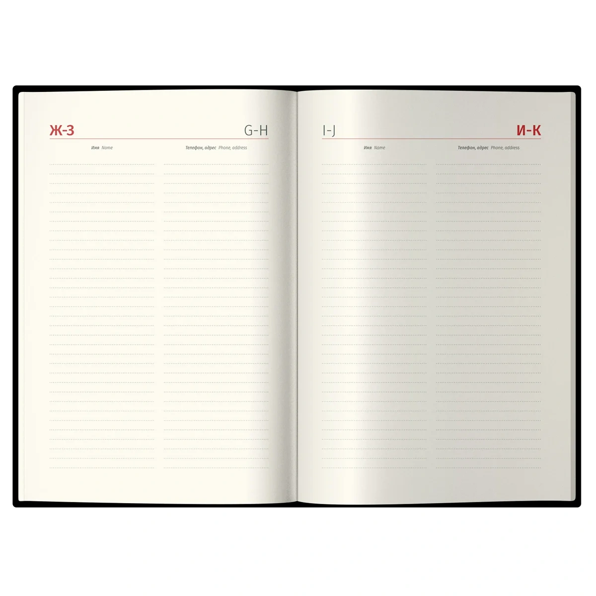 Внутренний блок состоит из 184 листов высококачественной кремовой бумаги повышенной плотности 80 г/м2 с пантонной печатью блока в 2 краски. Блок имеет перфорированные уголки. Справочный материал, 2 удобных закладки-ляссе, отрывные заметки, бланки-извещения о ДТП и вырубной блок по неделям гарантируют комфорт при использовании ежедневника. Изделие подходит под персонализацию. Упаковано в подарочную матовую индивидуальную упаковку. Обладателя ежедневника также порадуют 3 комплекта стикеров.