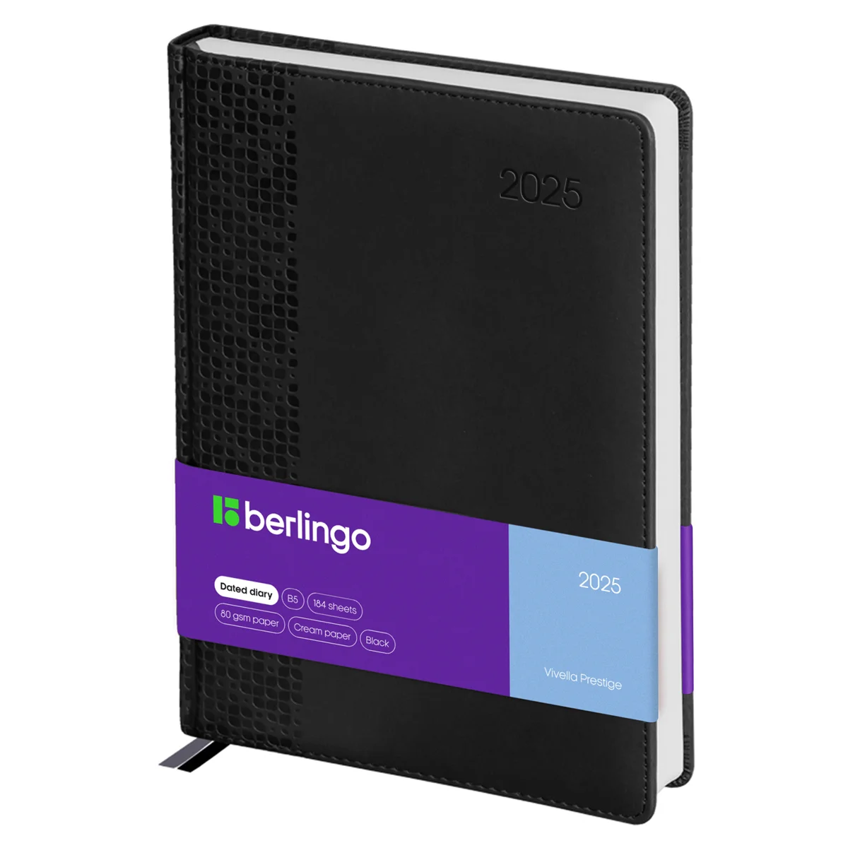 Стильный датированный ежедневник на 2025 год Berlingo Vivella Prestige формата В5 (175*250 мм) с классической твёрдой матовой обложкой из высококачественной экокожи чёрного цвета. Имиджевое тиснение на обложке добавляет интересную деталь в насыщенной цвет обложки.