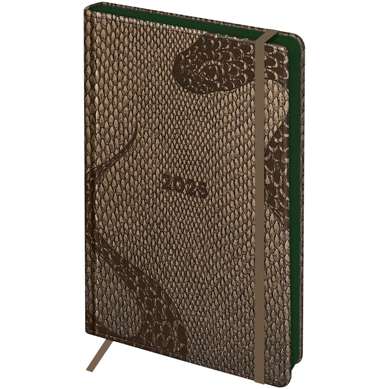 Ежедневник датированный на 2025 BG 'Pythone' – это не только практичный помощник, но и стильный аксессуар. Тиснение с символом года – змеёй – на имитированной под рептилию экокоже цвета хаки смотрится лаконично. Такое изделие подчеркнёт статус и изысканный вкус владельца.