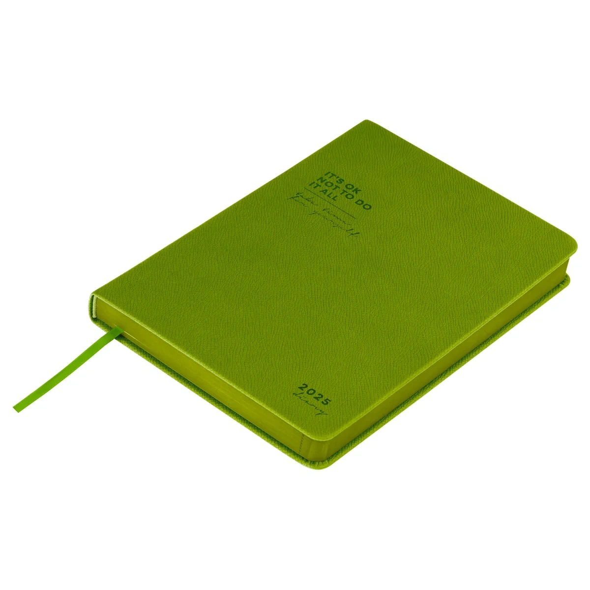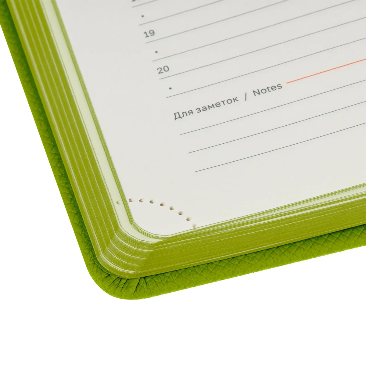 Яркая обложка из светло-зелёной экокожи привлекает взгляды и моментально придает образу элегантности. Но эстетическая привлекательность – лишь одно из множества его преимуществ. Твёрдая и прочная обложка обеспечивает надёжную защиту содержимого от повреждений, сохраняя изделие в идеальном состоянии длительное время. Практичная закладка-ляссе поможет быстро найти нужную страницу, а тонированный в цвет обложки срез придаёт ежедневнику завершенный и стильный вид. Внутри предусмотрена справочная информация, ежемесячный планер, календарь и другие полезные сведения.