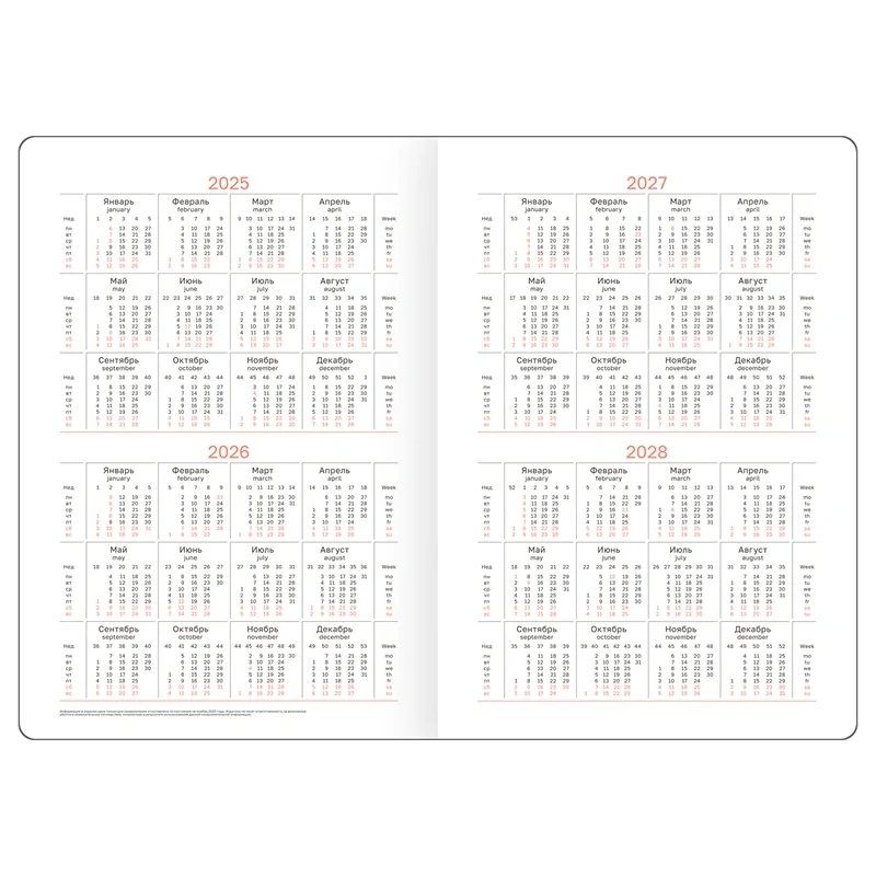 Перфорированные уголки и закладка-ляссе обеспечат комфорт и удобство при использовании ежедневника. В ежедневнике предусмотрена справочная информация, таблицы, календарь на 4 года и другие полезные сведения. Датированный ежедневник подходит под персонализацию. Индивидуальная упаковка в термоусадочную пленку.