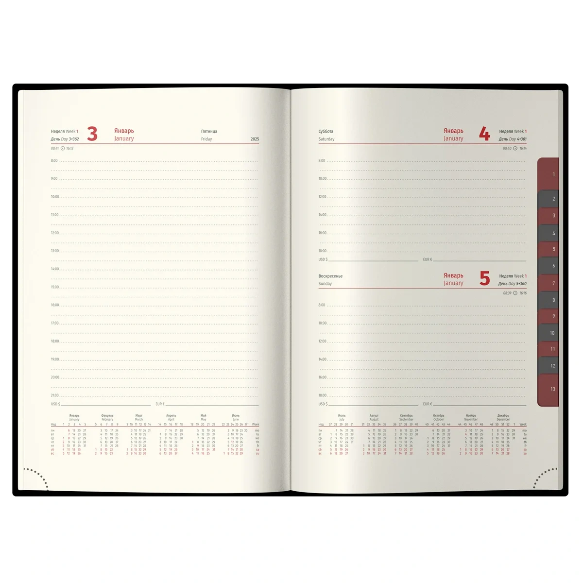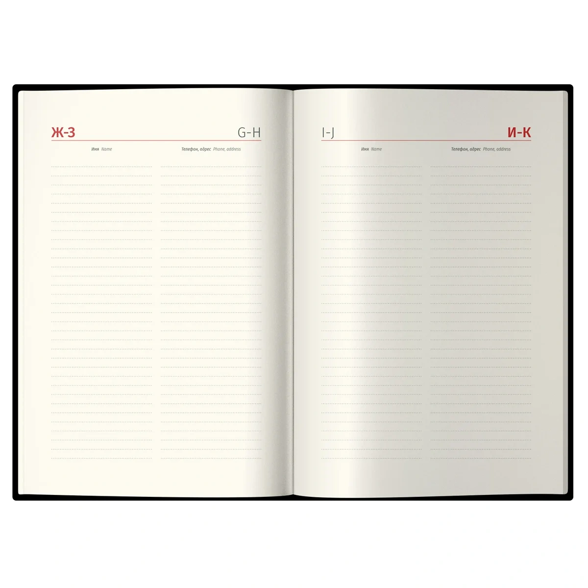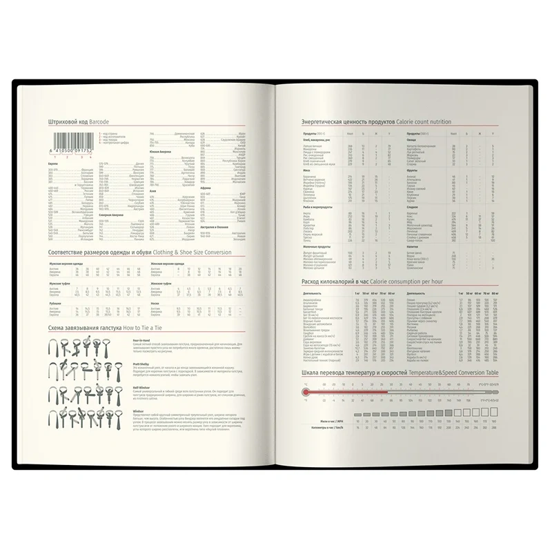 Внутренний блок состоит из 184 листов высококачественной кремовой бумаги повышенной плотности 80 г/м2 с пантонной печатью блока в 2 краски. Блок имеет перфорированные уголки. Справочный материал, 2 удобных закладки-ляссе, отрывные заметки, бланки-извещения о ДТП и вырубной блок по неделям гарантируют комфорт при использовании ежедневника. Изделие подходит под персонализацию. Упаковано в подарочную матовую индивидуальную упаковку. Обладателя ежедневника также порадуют 3 комплекта стикеров в подарок.