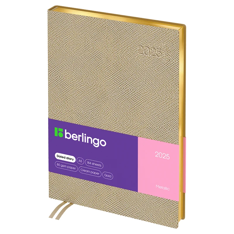 Стильный датированный ежедневник на 2025 год Berlingo Metallic формата А5 с ультрамягкой обложкой из многослойной экокожи. Обложка цвета золотой металлик в сочетании с золотым срезом. Внутренний блок состоит из 184 листов высококачественной кремовой бумаги повышенной плотности 80 г/м? с пантонной печатью в 2 краски. датированный ежедневник на 2025 год Berlingo Metallic представлен в размере 150 на 215 мм.