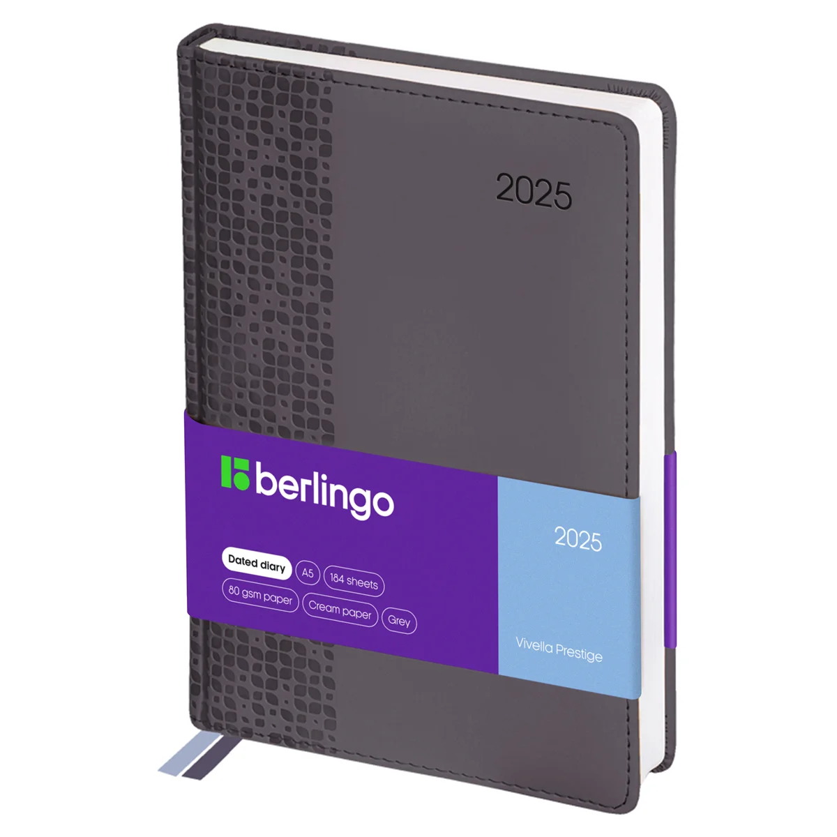 Стильный датированный ежедневник на 2025 год Berlingo 'Vivella Prestige' формата А5 (150*215 мм) с классической твёрдой матовой обложкой из серой высококачественной экокожи. Имиджевое тиснение на обложке добавляет интересную деталь в её насыщенный цвет.