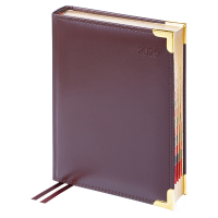 Изысканный датированный ежедневник Delucci формата A6 (115*160 мм) ? элегантный помощник для планирования. Обложка ежедневника с поролоновой прослойкой изготовлена из премиальной глянцевой экокожи, имитирующей кожу первоклассной выделки, и прошита двойной строчкой. Цвет обложки ? коричневый. Изделие дополняют золотые металлические уголки и золотой фольгированный срез блока.