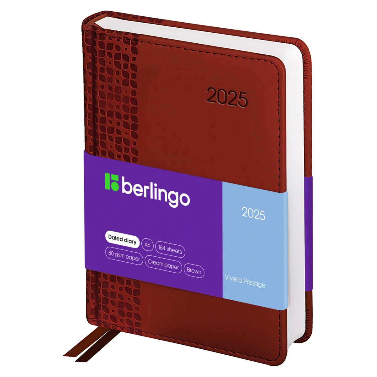 Стильный датированный ежедневник на 2025 год Berlingo Vivella Prestige формата А6 (115*160 мм) с классической твёрдой матовой обложкой из коричневой высококачественной экокожи. Имиджевое тиснение на обложке добавляет интересную деталь в насыщенной цвет обложки.
