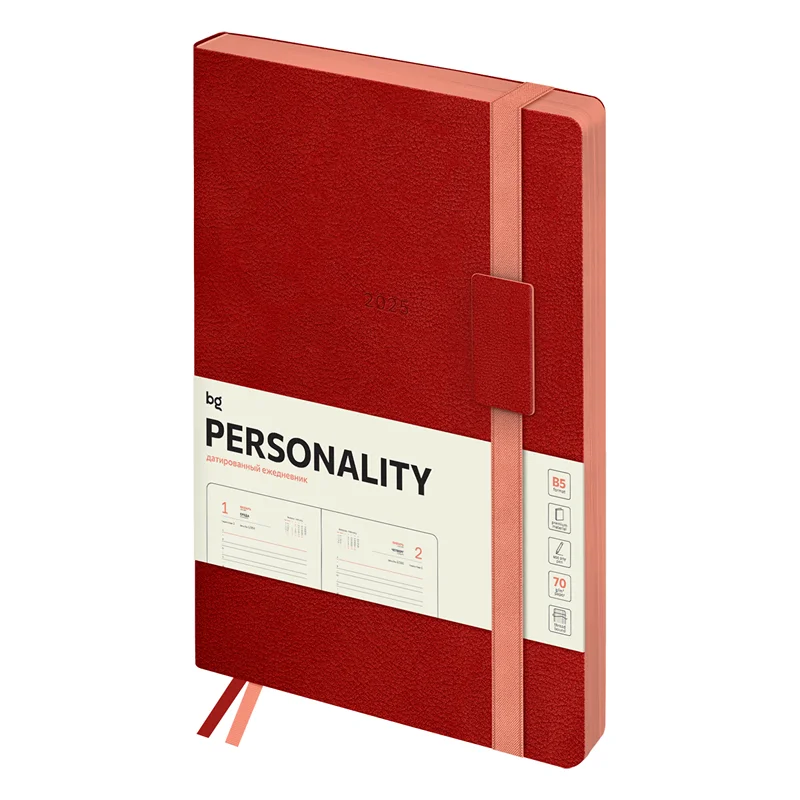 Ежедневник датированный на 2025 год BG 'Personality' формата В5 – это не только практичный помощник, но и стильный аксессуар. Мягкая обложка выполнена из экокожи и дополнена тиснением.