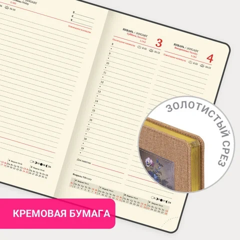 Внутренний блок включает 168 листов кремовой бумаги плотностью 70 г/м2. Каждая страничка имеет перфорированный угол. Благодаря стандартному формату А5 (138х213 мм) датированный ежедневник удобно использовать как в офисе, так и на выездных деловых встречах.