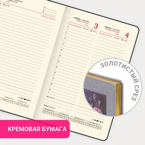 Внутренний блок включает 168 листов кремовой бумаги плотностью 70 г/м2. Каждая страничка имеет перфорированный угол. Благодаря стандартному формату А5 (138х213 мм) датированный ежедневник удобно использовать как в офисе, так и на выездных деловых встречах.