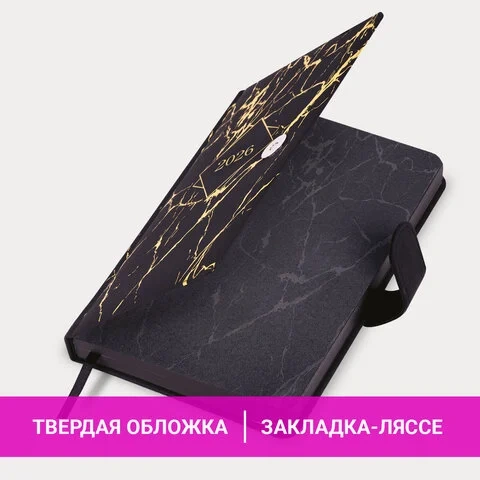 Ежедневник датированный 2026 А5 138x213 мм, BRAUBERG 'Goldy', под кожу, цветной срез, черный, 117470