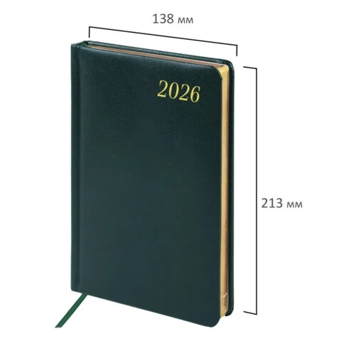 Внутренний блок включает 168 листов тонированной бумаги плотностью 70 г/м2. Каждая страничка имеет перфорированный угол. Благодаря стандартному формату А5 (138х213 мм) ежедневник удобно использовать как в офисе, так и на выездных деловых встречах. Твердая обложка стилизована под кожу рептилии благородного темно-зеленого цвета. Подходит для горячего тиснения. Срез ежедневника фольгирован золотой фольгой, что придает ему особый шарм. Дополнением является закладка-ляссе, с помощью которой при необходимости можно быстро открыть ежедневник на нужной странице.