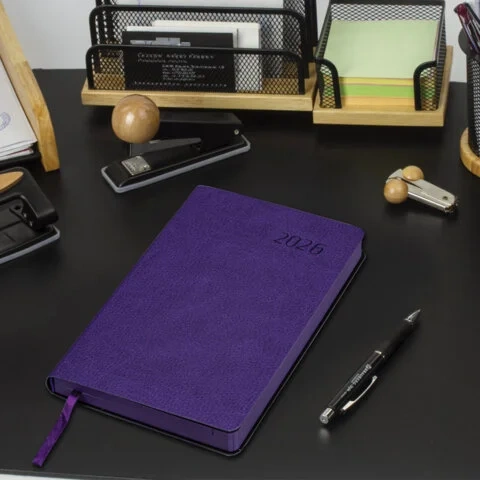 Мягкая (интегральная) обложка стилизована под фактурную кожу яркого фиолетового цвета. Подходит для горячего тиснения. Дополнением является закладка-ляссе, с помощью которой при необходимости можно быстро открыть ежедневник на нужной странице. Ежедневник снабжен справочным материалом. В конце есть 4 страницы для записей и заметок.