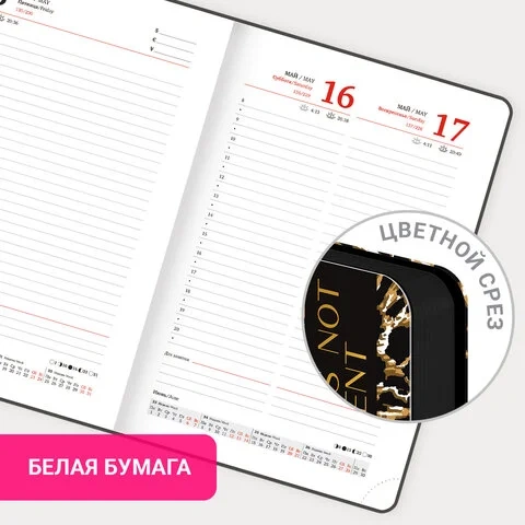 Внутренний блок включает 168 листов белой бумаги плотностью 70 г/м2. Каждая страничка имеет перфорированный угол. Благодаря стандартному формату А5 (138х213 мм) ежедневник удобно использовать как в офисе, так и на выездных деловых встречах.