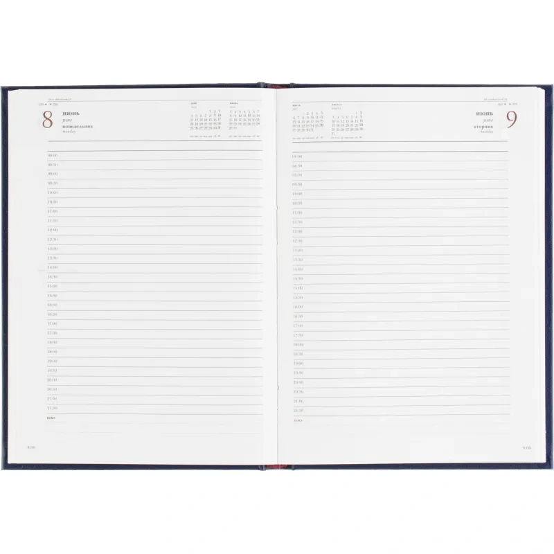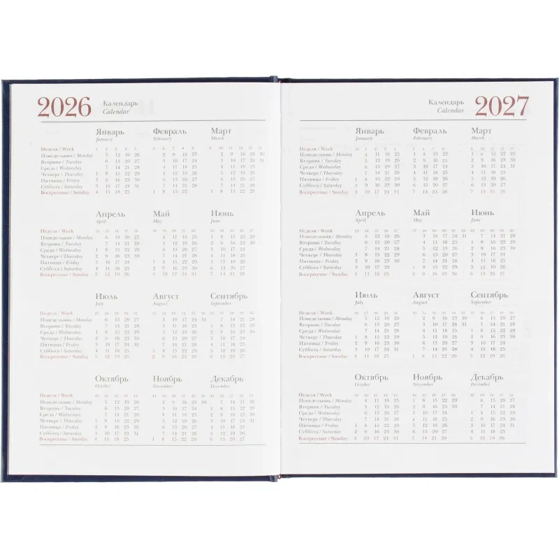 Внутренний блок содержит 168 листов белой офсетной бумаги плотностью 60 г/кв. м, с линейной разметкой и двухцветной печатью. Крепление выполнено в виде сшивки, что делает ежедневник надёжным и долговечным. В блоке предусмотрена датированная разметка на 2026 год, а также календарь на 2 года.