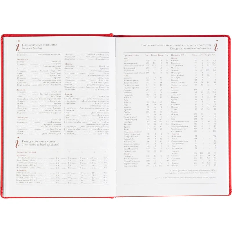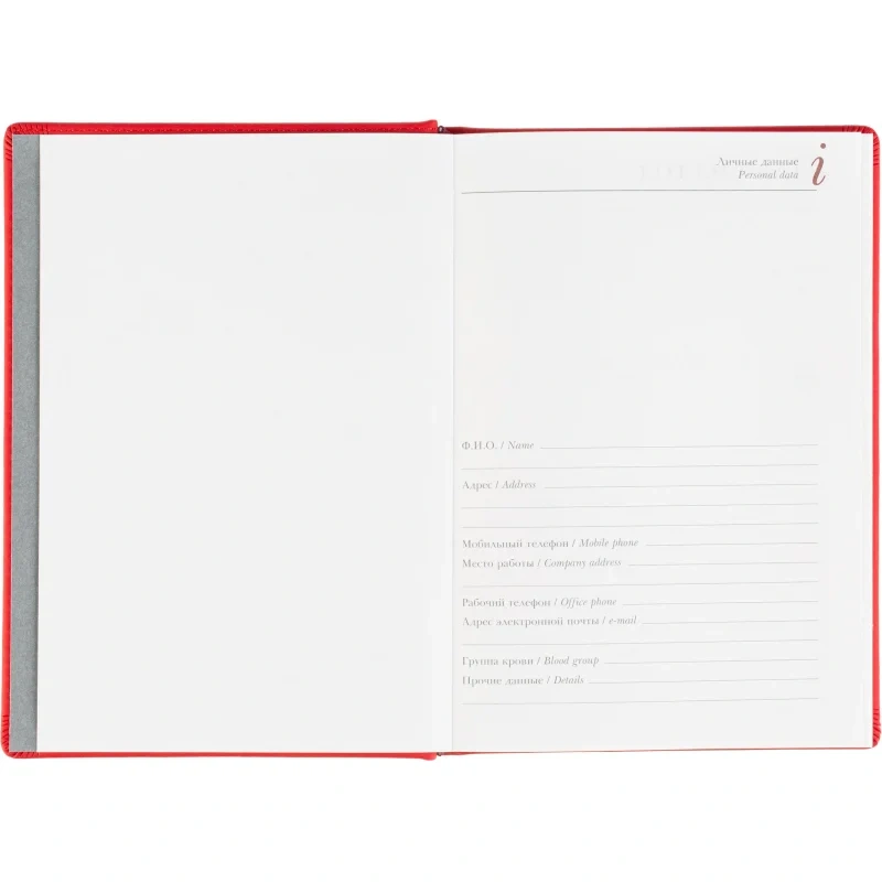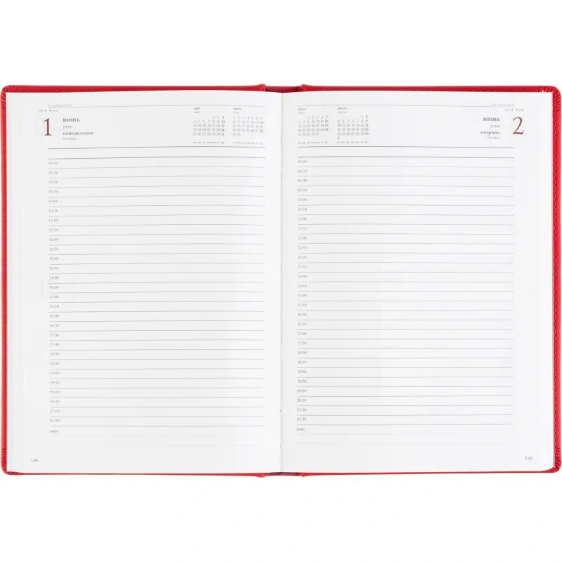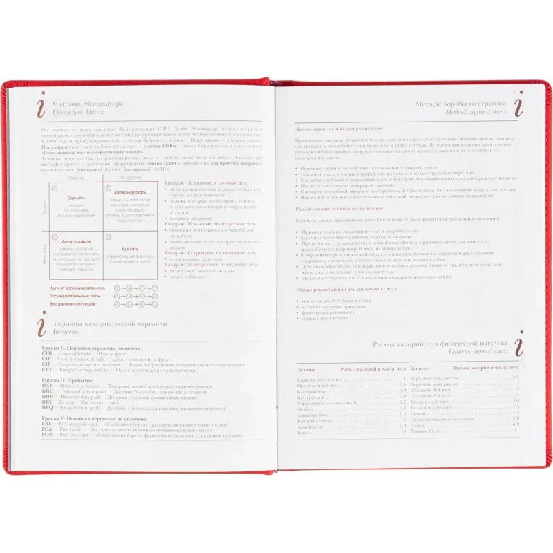 Внутренний блок состоит из 168 листов белой офсетной бумаги плотностью 70 г/кв. м, с линейной разметкой и двухцветной печатью. Крепление выполнено с помощью сшивки, что гарантирует надёжность при ежедневном использовании. В ежедневнике предусмотрена датированная сетка на 2026 год и календарь на 2 года. Углы листов прямые, вырубка и перфорация отсутствуют.