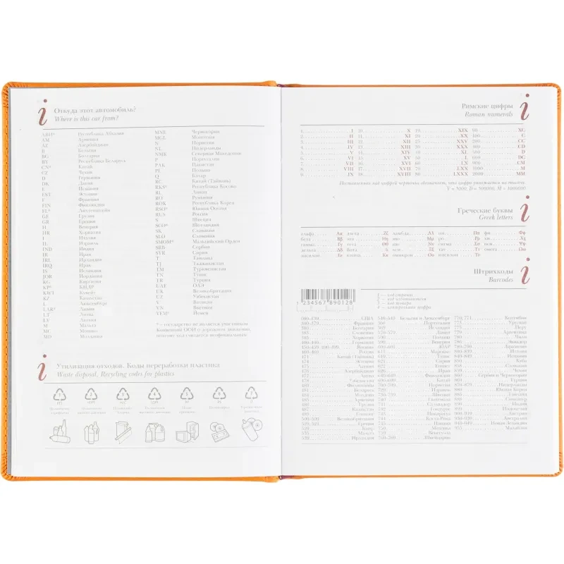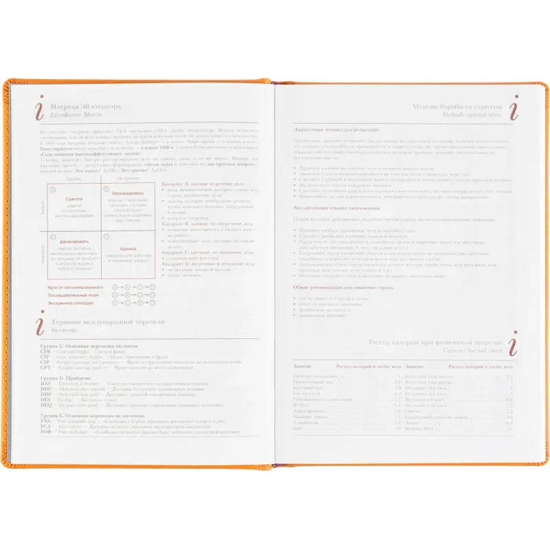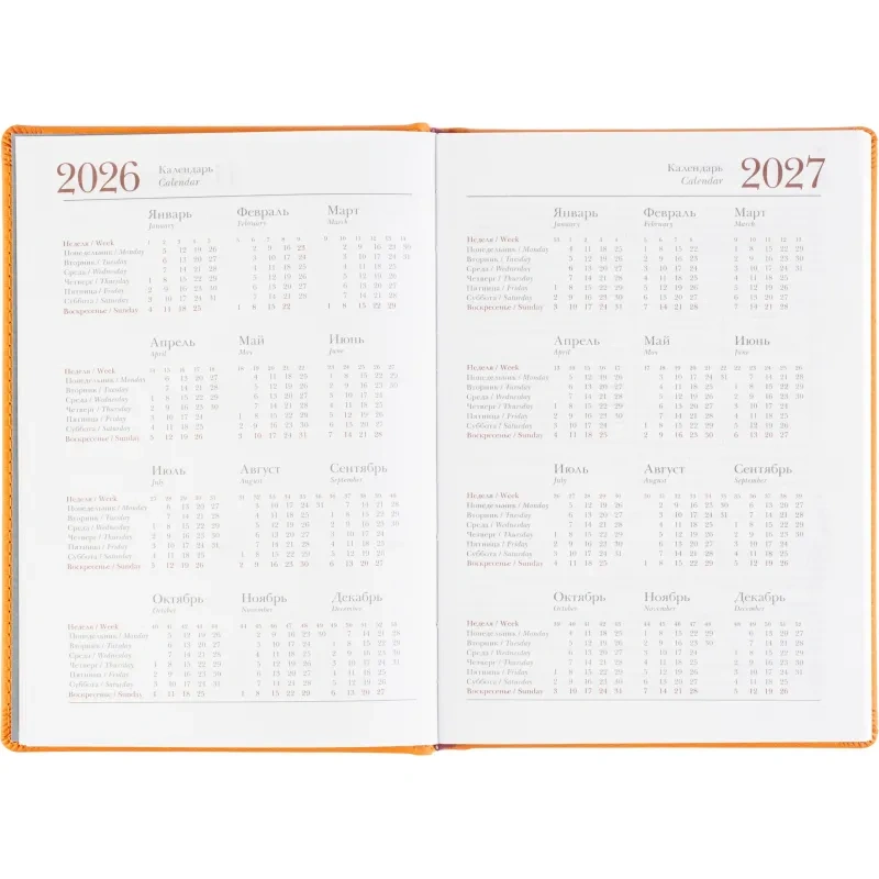 Внутренний блок включает 168 листов белой офсетной бумаги плотностью 70 г/кв. м, разлинованных в линейку и напечатанных в две краски. Страницы соединены сшивкой, обеспечивающей надёжность крепления. В ежедневнике предусмотрена датированная разметка на 2026 год и календарный блок на 2 года. Листья без скругления, перфорации и вырубки.