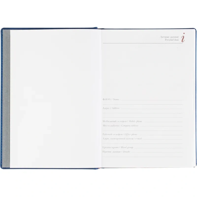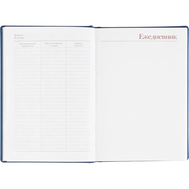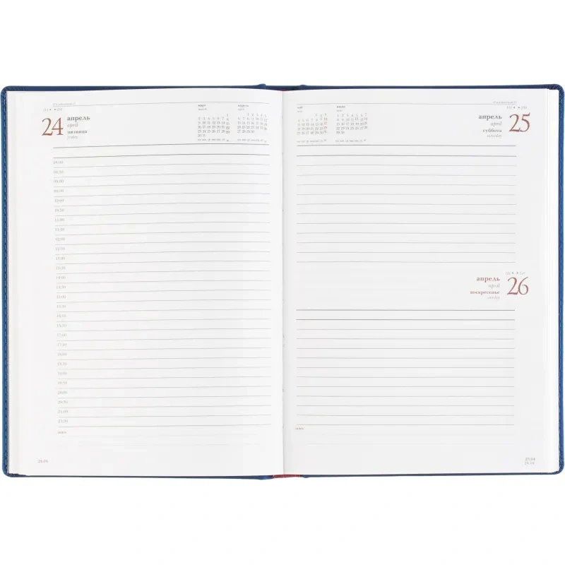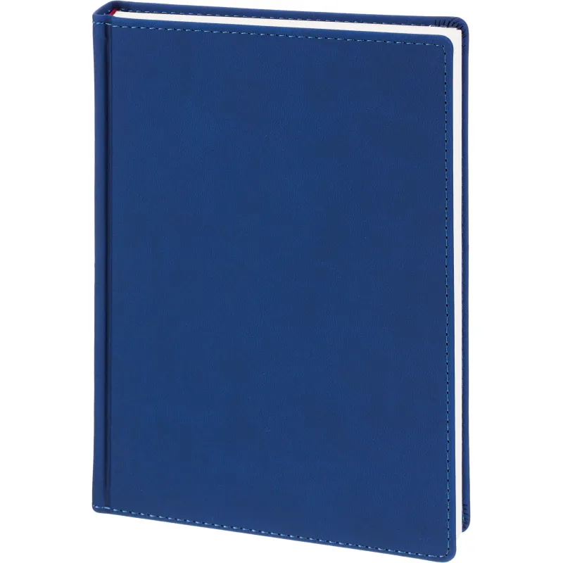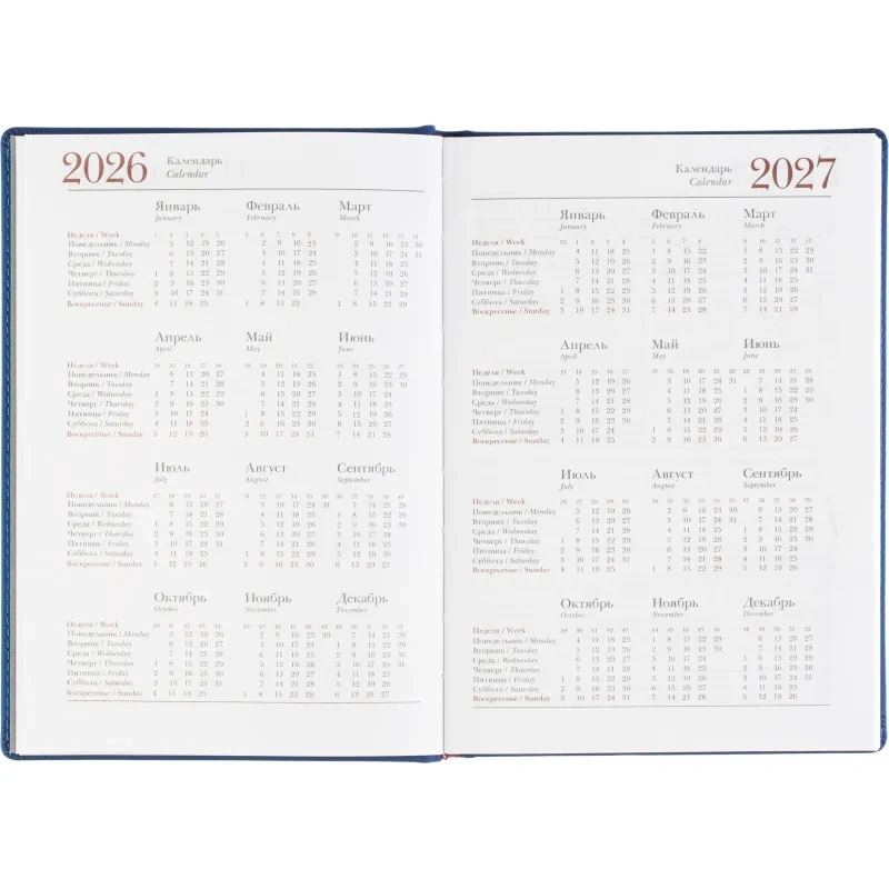 Внутренний блок содержит 168 листов белой офсетной бумаги плотностью 70 г/кв. м, с линейной разметкой и двухцветной печатью. Листы скреплены сшивкой, что делает ежедневник прочным и долговечным. Включена датированная разметка на 2026 год, а также календарный блок на 2 года. Листья без скругления, перфорации и вырубки.