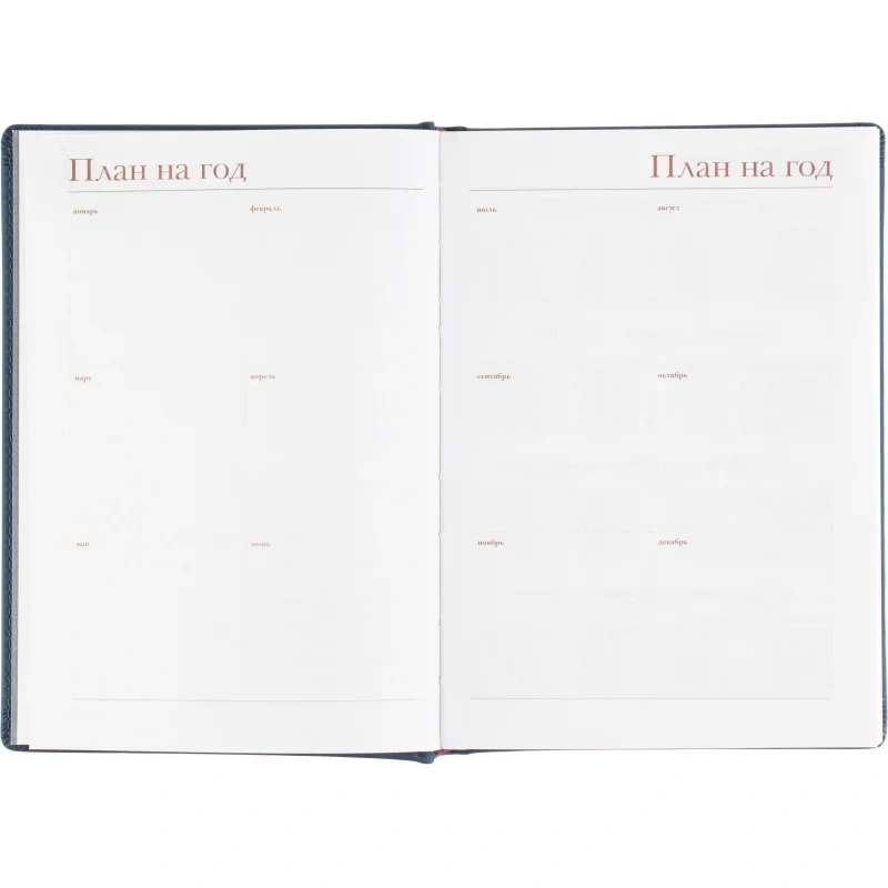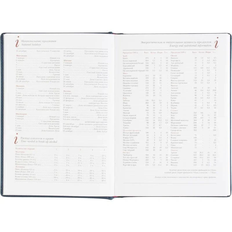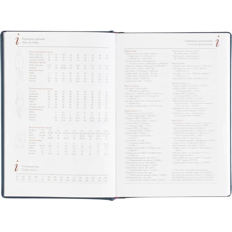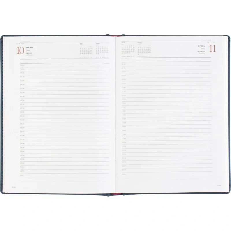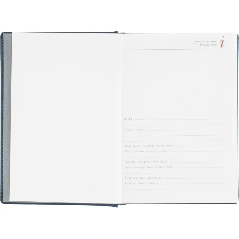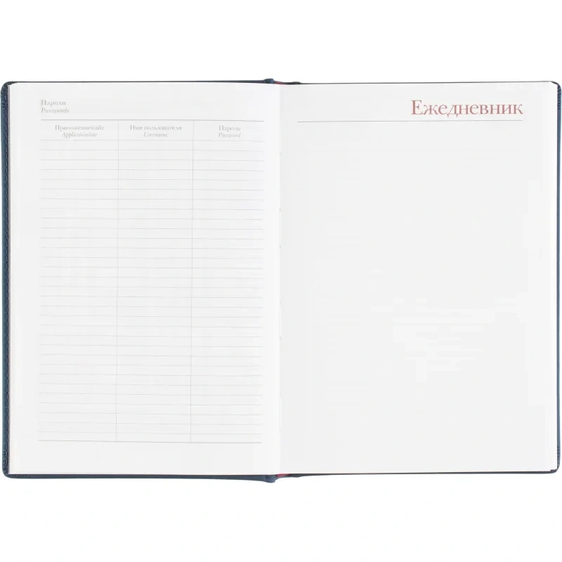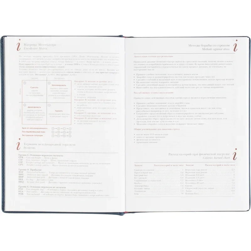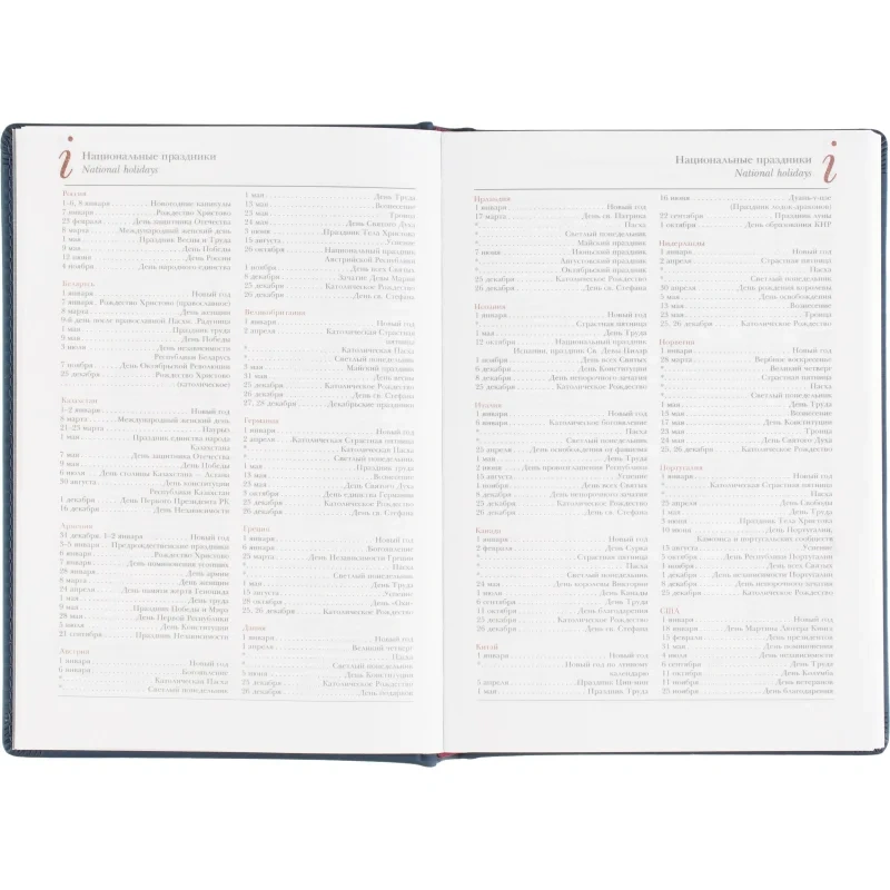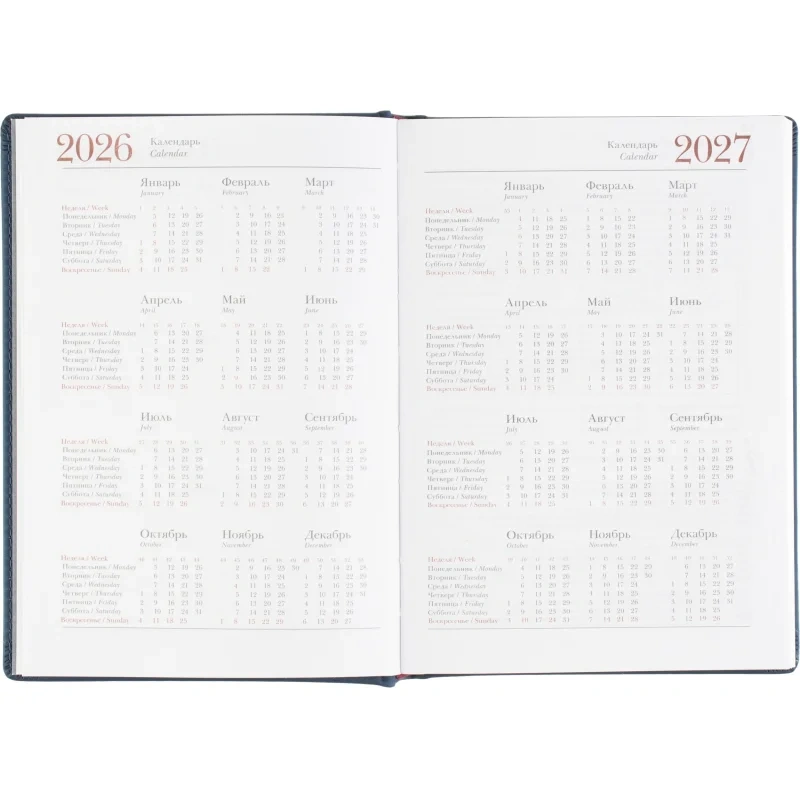 Внутренний блок состоит из 168 листов белой офсетной бумаги плотностью 70 г/кв.м, с линейной разметкой и двухцветной печатью. Крепление выполнено на сшивке, что обеспечивает надёжность при ежедневном использовании. В ежедневнике предусмотрена датированная разметка на 2026 год и календарный блок на 2 года. Листы не имеют скруглённых углов, перфорации и вырубки.