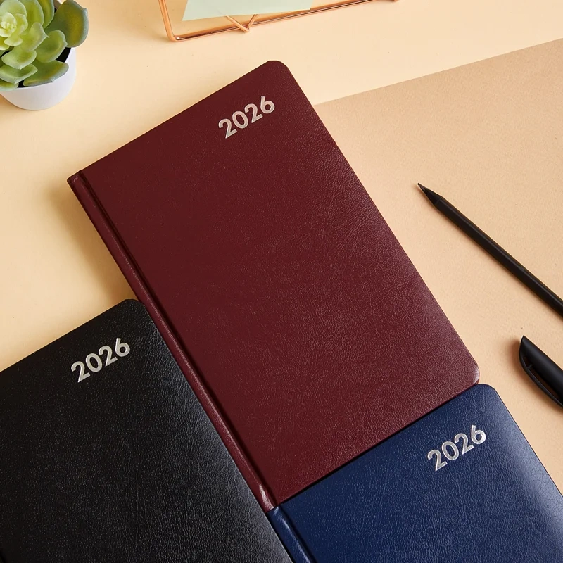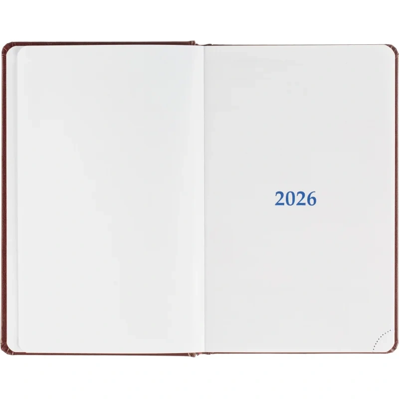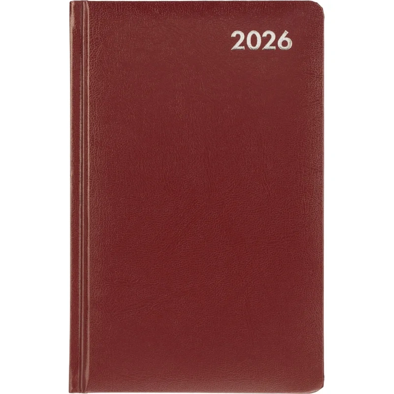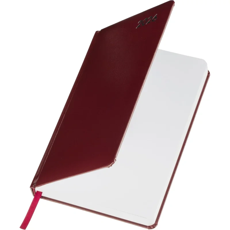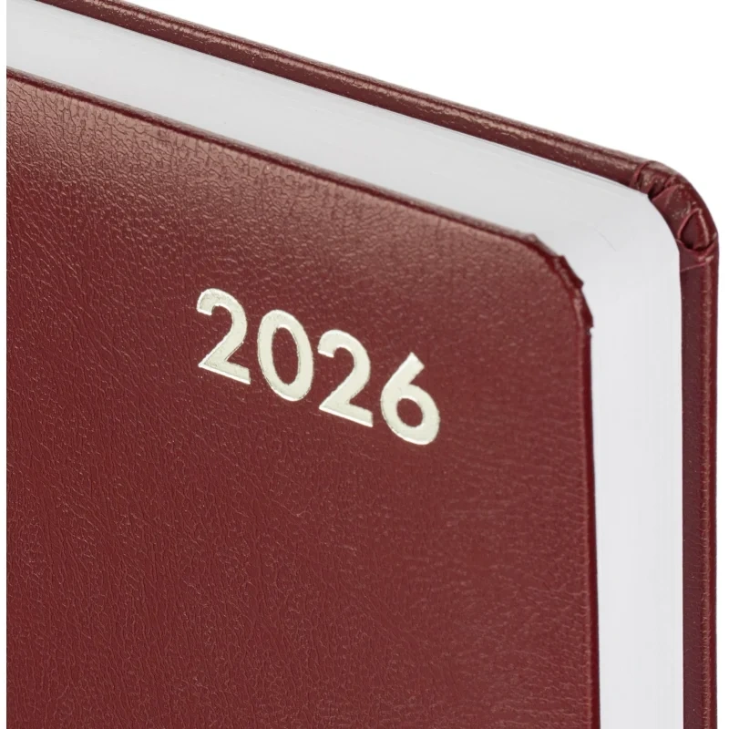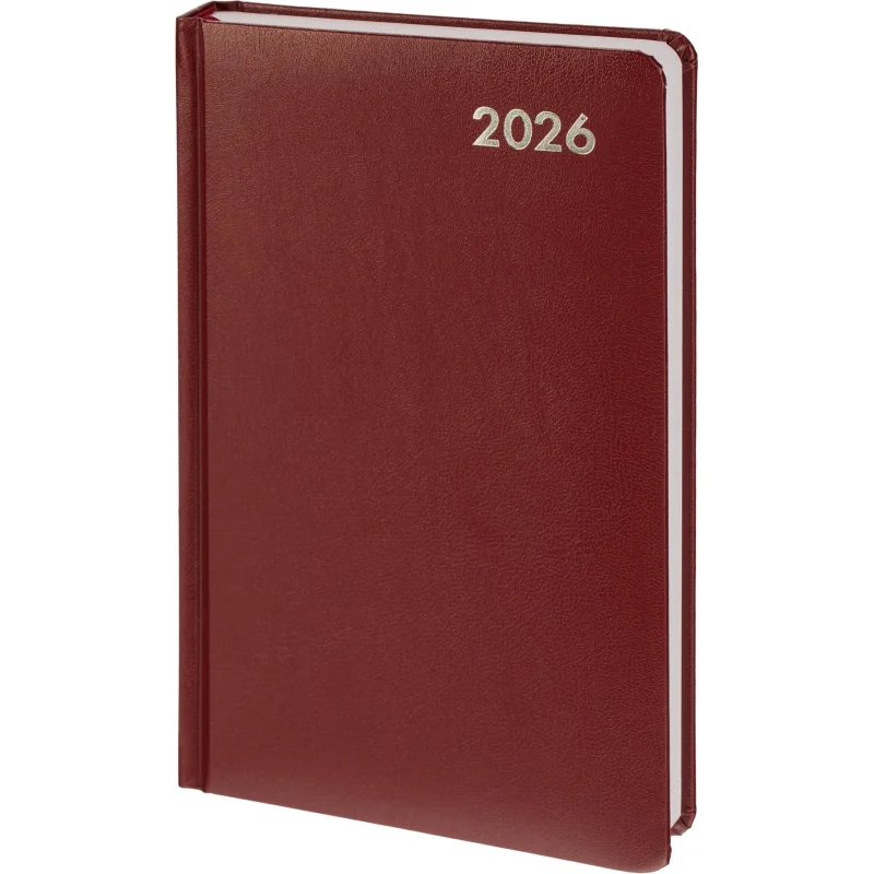 Ежедневник формата A5 подходит для повседневного планирования задач в течение 2026 года. Обложка выполнена из балакрона бордового цвета с тиснением фольгой и оформлена в однотонном стиле. Твёрдый переплёт сохраняет форму изделия, а сшивка блока обеспечивает его прочность при регулярном использовании.