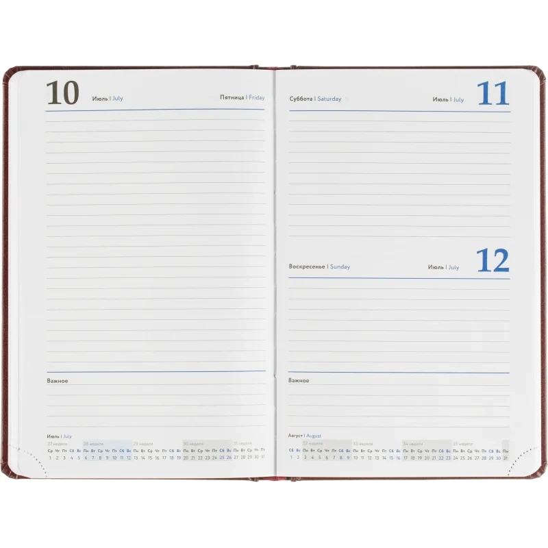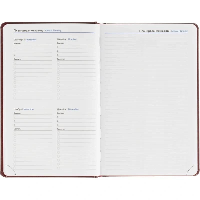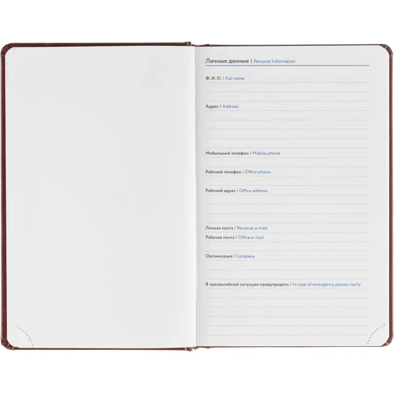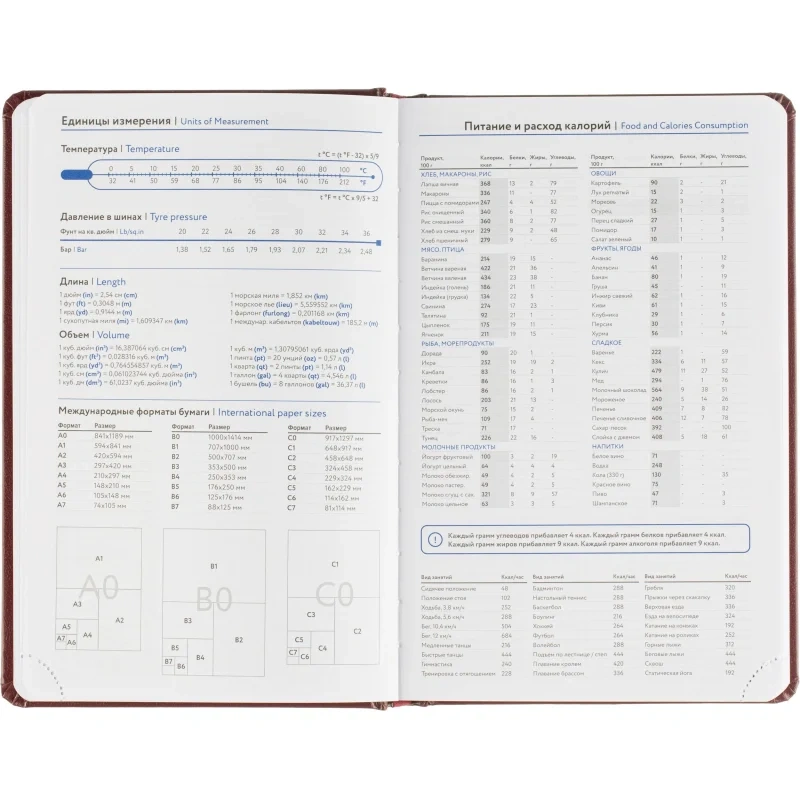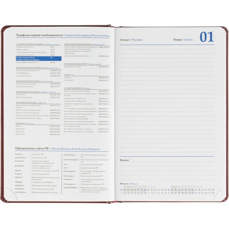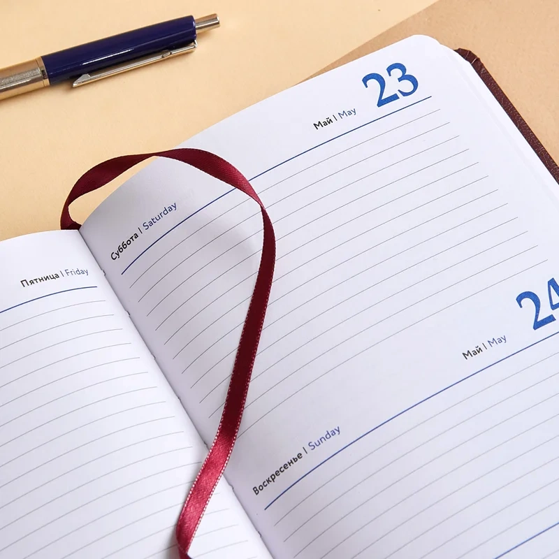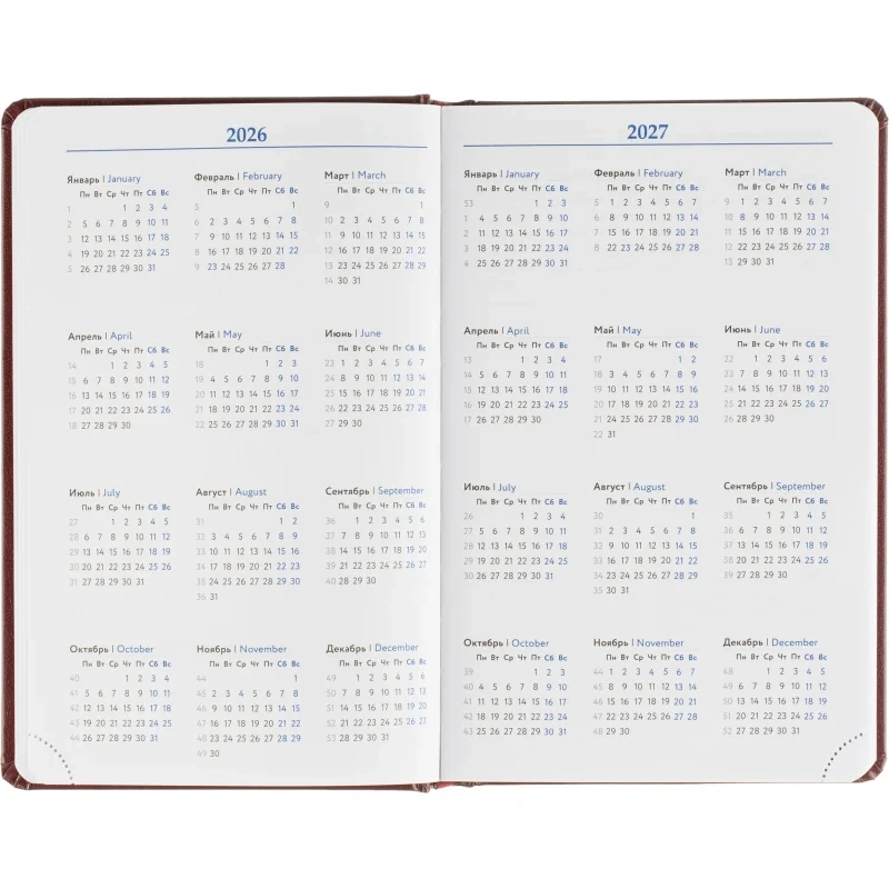 Размер изделия составляет 13.8×21.3 см. Внутри расположен календарь на два года. Ежедневник подходит под персонализацию.